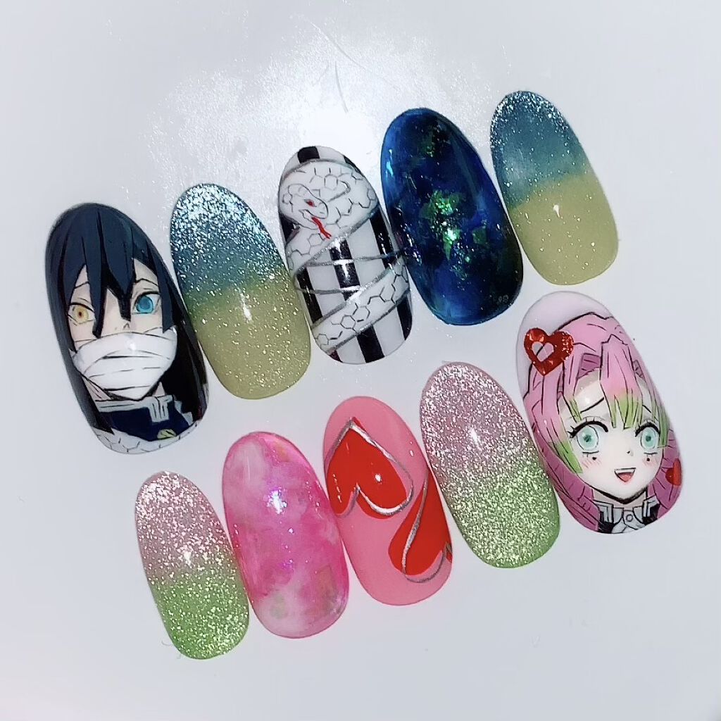 鬼滅ネイル💗💚💛❤️💜こんばんわ🌃今回は初の痛ネイル挑戦してみました🥺👺鬼滅の刃ネイル👺です😂簡単そうに見えたけど以外と細かいのと持っているライナー筆がそこまで細くないのでかなり苦戦しました😅(細いやつ買え)今回のように線や模様を描いていくと...