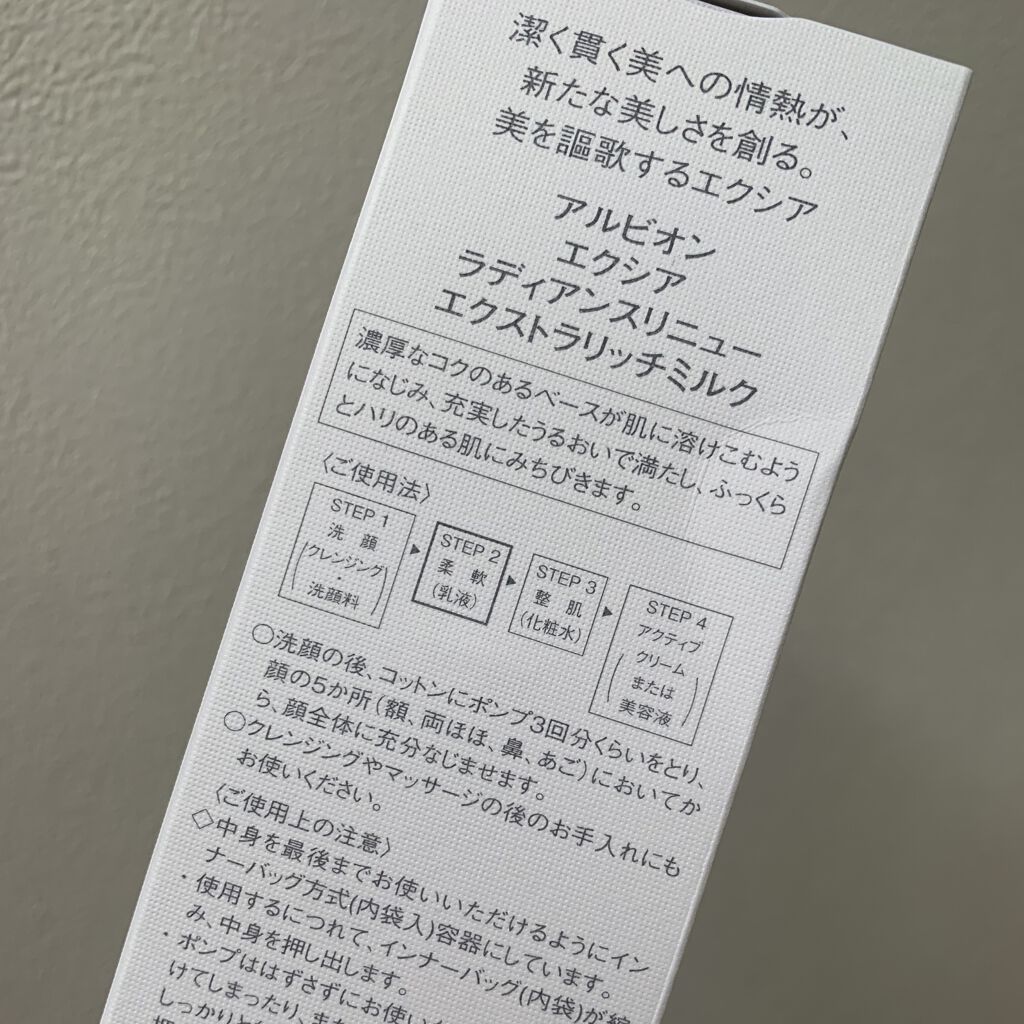 ふっくらとハリのある肌へみちびく なめらか肌に溶けこむような感じ やさしいフローラルの香り 気になってる方はチェックしてみてください ALBIONエクシアラディアンスリニューエクストラリッチミルク #エクシア #ラディアンスリニューエクストラリッチミルク