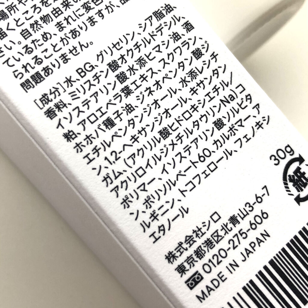 - 水、BG、グリセリン、シア脂油、香料、ミリスチン酸オクチルドデシル、イソステアリン酸水添ヒマシ油、酒粕、アロエベラ葉エキス、スクワラン、ホホバ種子油、ジネオペンタン酸ジエチルペンタンジオール、水添レシチン、1,2-ヘキサンジオール、キサンタンガム、(アクリル酸ヒドロキシエチル/アクリロイルジメチルタウリンNa)コポリマー、イソステアリン酸ソルビタン、ポリソルベート60、カルボマー、アルギニン、トコフェロール、フェノキシエタノール