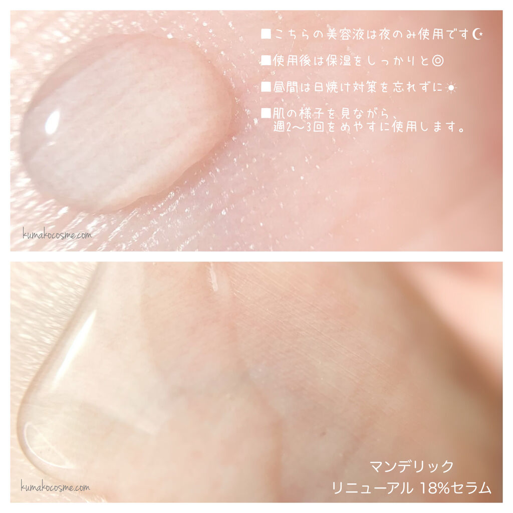 台湾発のスキンケアブランド【DR.WU】の人気アイテム「マンデリック インテンシブ18%セラム」は、敏感肌にも使える角質ケア美容液です。 無色透明でさらっとしたテクスチャーになっているのでベタつき感は特には感じることなく使えるので気に入っています。 DR.WU独自の「黄金濃度18%」マンデル酸(杏仁酸)を配合されておりこちらがすごく特徴的でおすすめポイントです。
