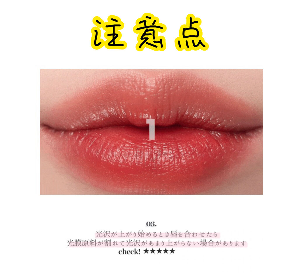 - 透明に輝くウォーターカバーを唇に乗せる ①カラーと光沢層が分離されているので透明感アップ #水膜ティント ②ウォーターティント並みの #色づき ③ベタつき感ゼロ、潤いだけを残す #ちゅるんとリップティント