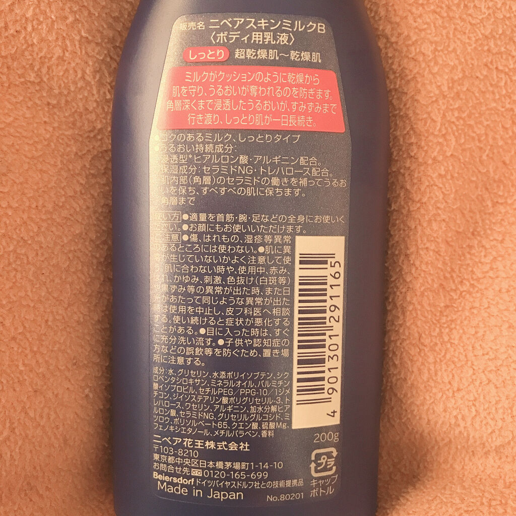 乾燥が気になる季節になってくるとこちらを毎年購入しています! 私は近くの薬局で¥350ほどで購入しました! ミルクがクッションのように乾燥から肌を守り、潤いが奪われるのを防ぎます。 ・コクのあるミルク、しっとりタイプ 翌朝までしっとりと長続きしてくれます☺️ 香りはニベア缶の匂いを優しく甘くしたような香りがほんのりと続きます🫧