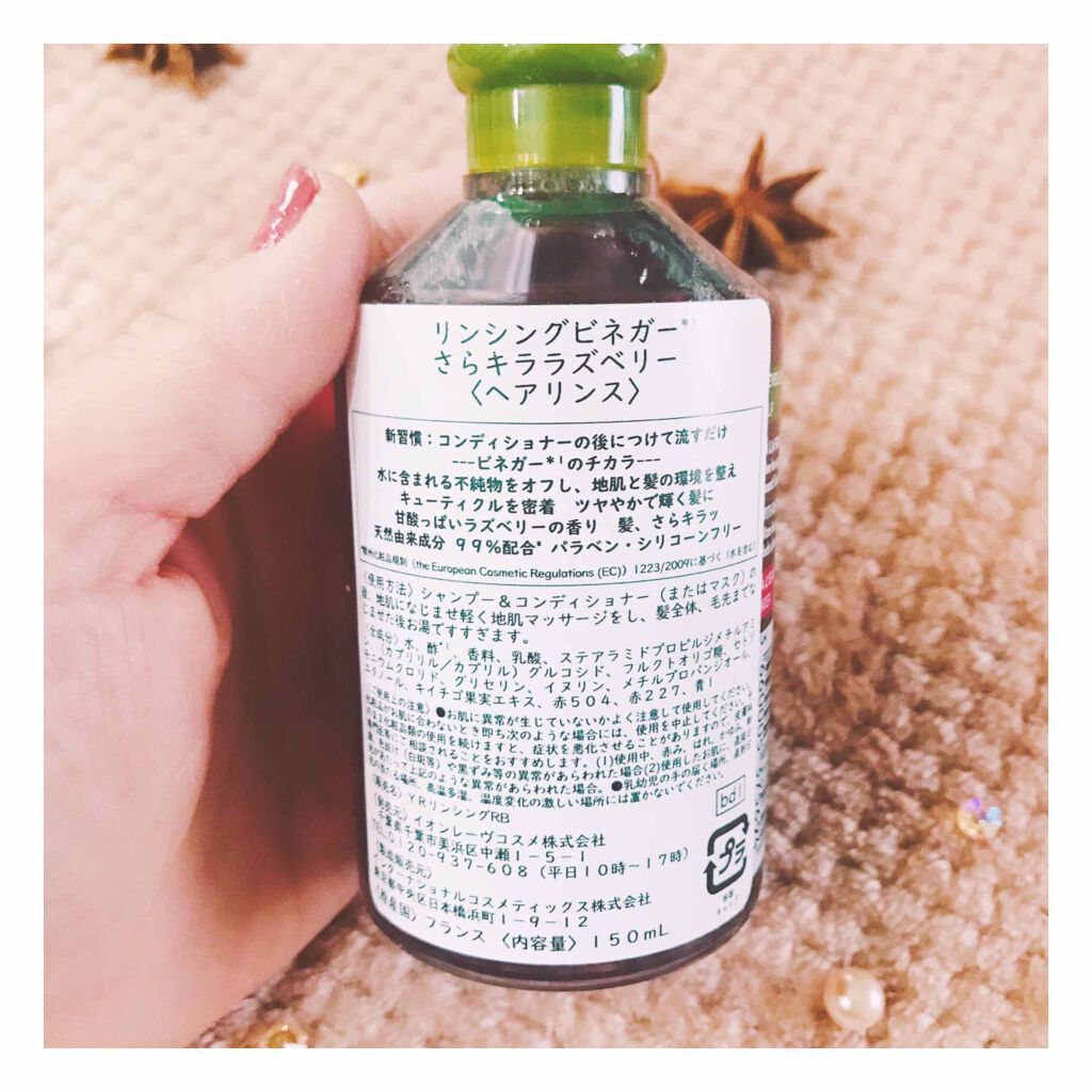 イヴ・ロシェリンシングビネガー・ピュアリフレッシュ うるつやモリンガ・シルキーシャイン さらキララズベリーこちらウエルシアでたまたま見つけて購入しました。コンディショナーやヘアマスクなどの後に頭皮や毛先に馴染ませて流すだけ!ビネガーのヘアトリ...