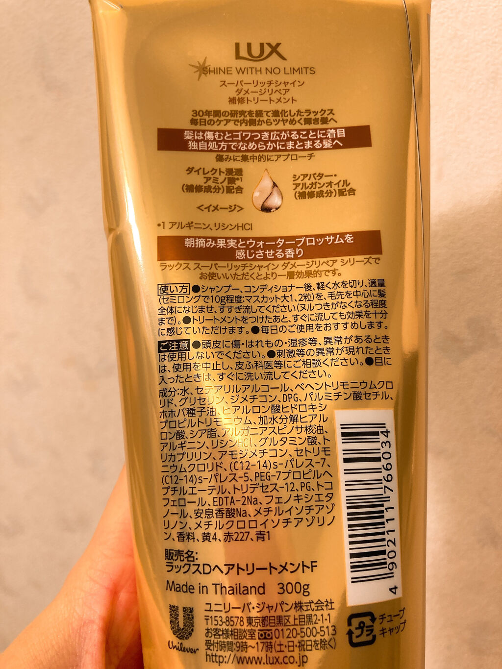 - 【傷んだ髪用】 ●洗い流すトリートメント: 触れるたび実感、輝くなめらか髪へと導く ●プレミアムゴールドヒアルロン酸オイル*1 (保湿成分)配合。髪を補修コーティング。 ●シアバター・アルガンオイル(補修成分)配合。日々のダメージも、カラーやパーマのケミカルダメージも内側まで濃密に補修 ●たっぷり使える大容量サイズも発売! ●朝摘み果実とウォーターブロッサムを感じさせる香り ●ラックス スーパーリッチシャインダメージリペア シリーズでお使いいただくとより一層効果的です。 *1 ホホバ種子油、ヒアルロン酸ヒドロキシプロピルトリモニウム、加水分解ヒアルロン酸