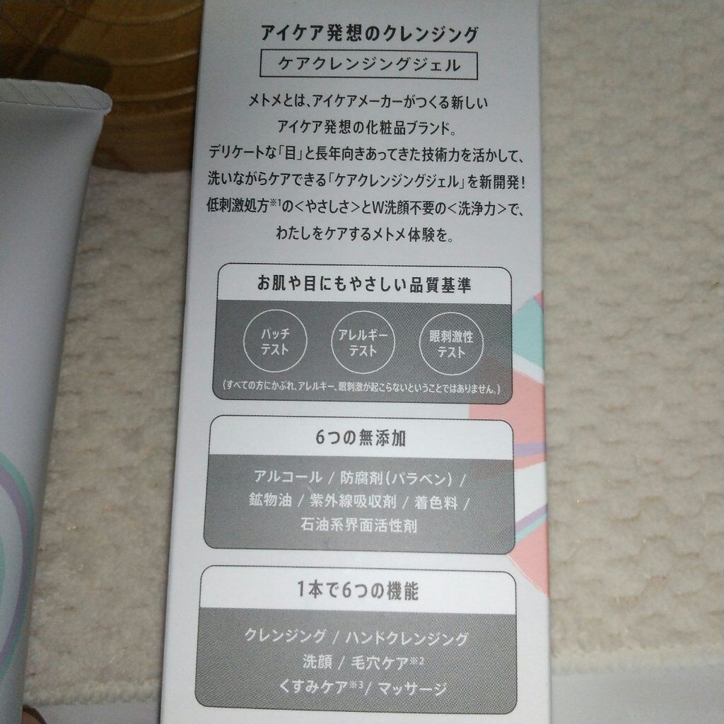 - 『ケアクレンジングジェル メトメ』は、肌にやさしいことはもちろん、メイクのポイントとしても欠かせない「目」にもやさしいクレンジングです。クレンジングの中でも摩擦の少ないジェルタイプで、皮膚がうすい目元でもやさしく洗うことができます。また、目に入ってもしみにくい低刺激処方で、目の際まですっきり洗うことができます。