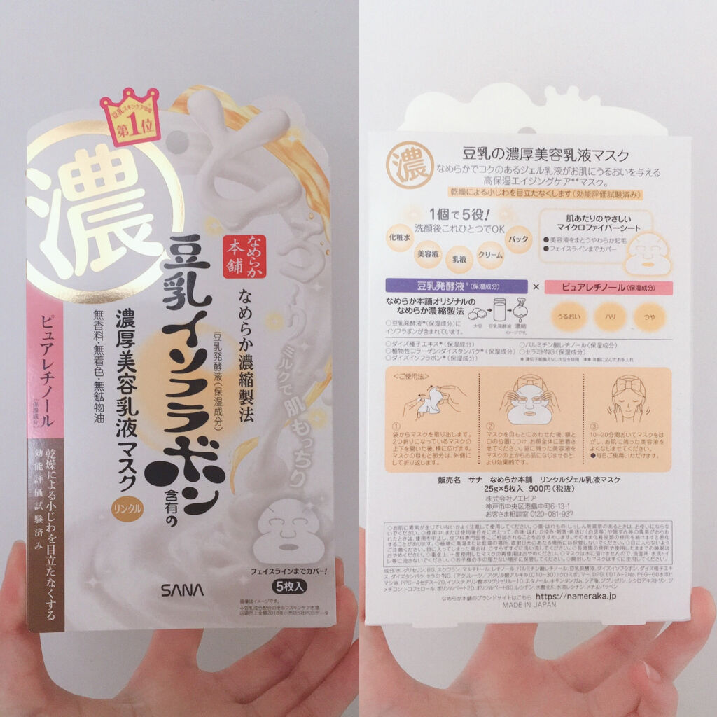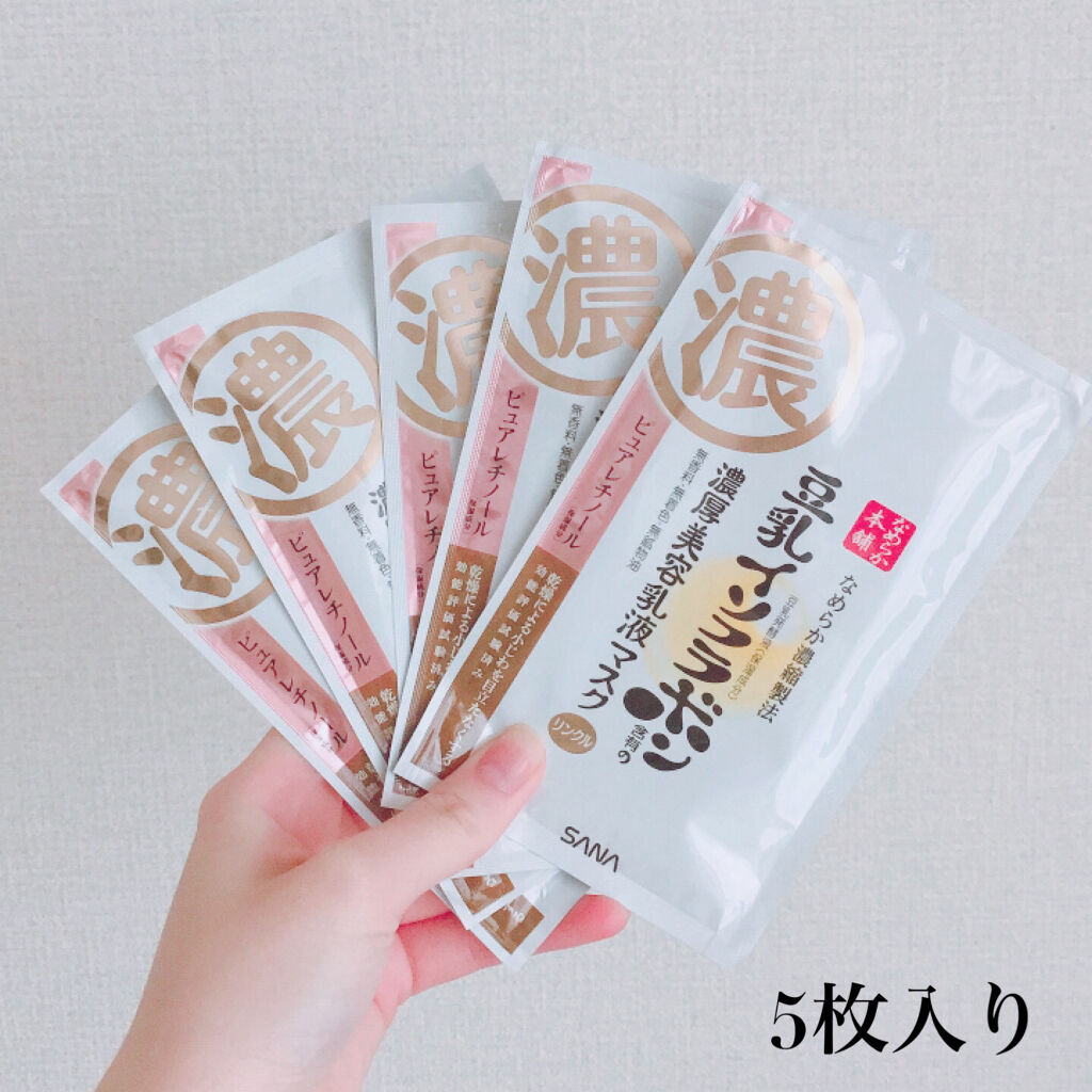 肌もっちりぷるぷる 《なめらか本舗》豆乳イソフラボンリンクルシートマスクN 20枚入り 大容量でとても使いやすかったパックです。ほどよい厚さのシートで5分~10分のお手軽マスク。 ピュアレチノール入りなので主に寝る前に使用していました。