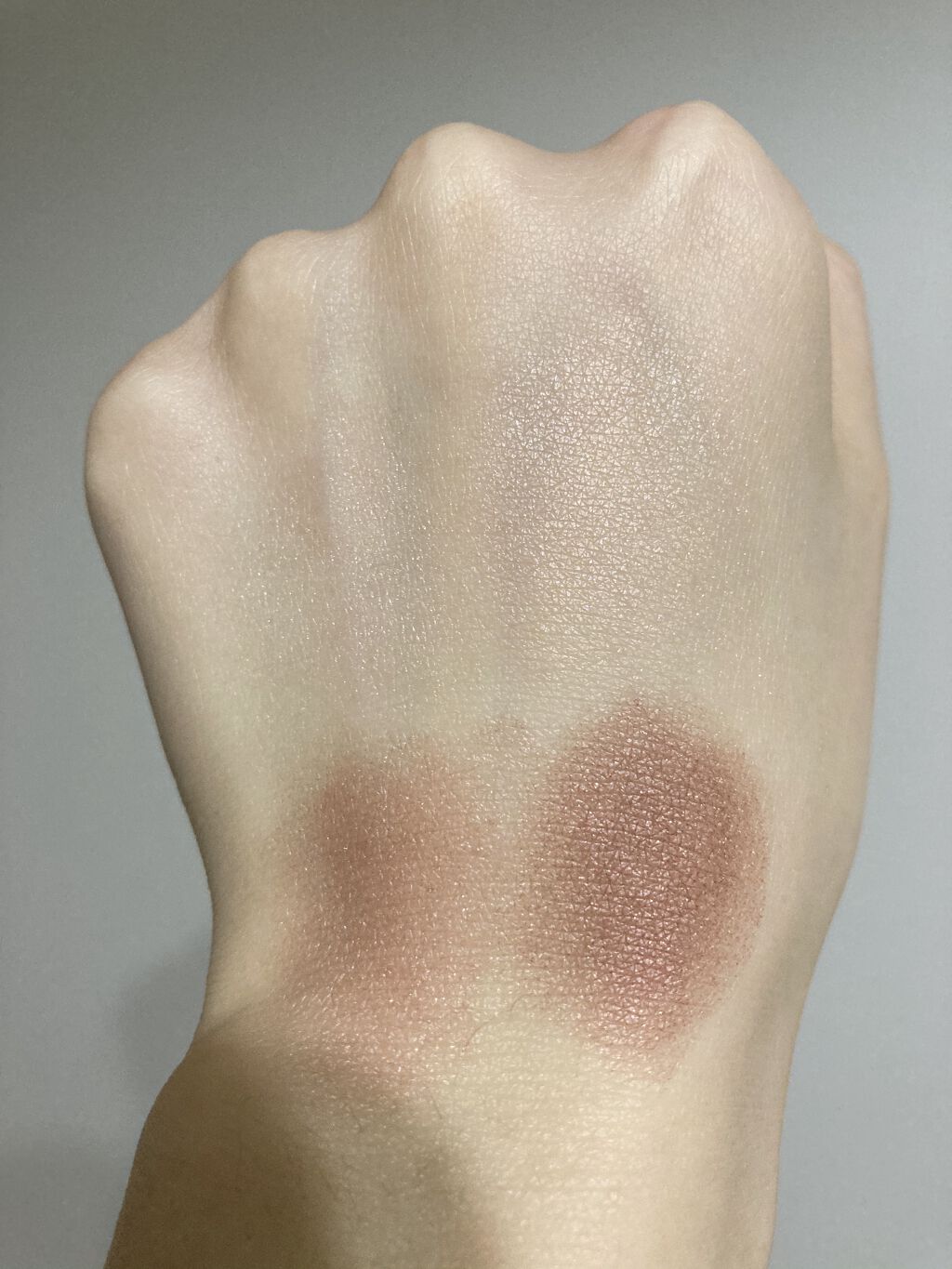 このアイシャドウは繊細なラメが入っていてまぶたに塗ると綺麗な光沢感が出ます✨ 真ん中のラメだけ少しギラっとしたラメ感になっています。 左下のオレンジはブラウンが混じったようなオレンジなのでとても使いやすくて深みも出せるので気に入っています🧡 右上のイエローはイチョウの葉のような色をしていてアイホール全体に塗ってもとっても可愛いカラーになっています😊 そして、真ん中の色はシルバーラメとピンクラメがたっぷり入っていて私は涙袋によく使っています☺️ 粉質はあまりしっとりはしていないので、私はアイシャドウベースを併用しています。 落ち着いた配色なのでこなれ感もあり、これ1つでオレンジメイクもイエローメイクもできてしまうので良いなと思いました🥰