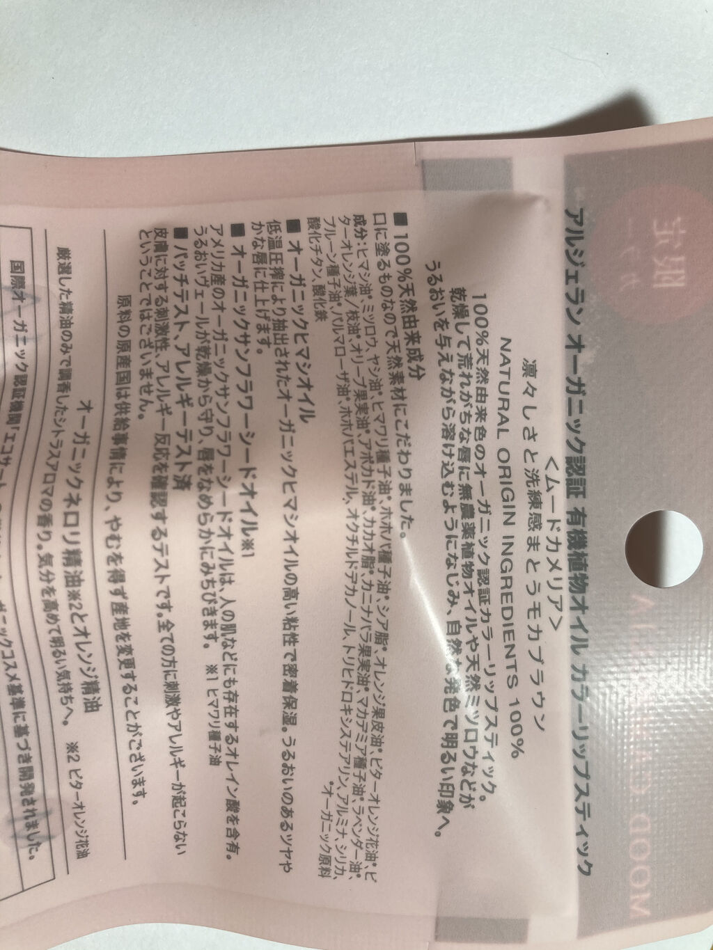 - <ムードカメリア> ヒマシ油、ミツロウ、ヤシ油、ヒマワリ種子油、ホホバ種子油、シア脂、オレンジ果皮油、ビターオレンジ花油、ビターオレンジ葉/枝油、オリーブ果実油、アボカド油、カカオ脂、カニナバラ果実油、マカデミア種子油、ラベンダー油、プルーン種子油、パルマローザ油、ホホバエステル、オクチルドデカノール、トリヒドロキシステアリン、アルミナ、シリカ、酸化チタン、酸化鉄 <アンバーローズ> ミツロウ、ヒマワリ種子油、ヒマシ油、ヤシ油、ホホバ種子油、シア脂、オレンジ果皮油、ビターオレンジ花油、ビターオレンジ葉/枝油、オリーブ果実油、アボカド油、カカオ脂、カニナバラ果実油、マカデミア種子油、ラベンダー油、プルーン種子油、パルマローザ油、ホホバエステル、オクチルドデカノール、トリヒドロキシステアリン、アルミナ、シリカ、酸化チタン、酸化鉄 <ベビーピオニー> ヒマシ油、ミツロウ、ヤシ油、ヒマワリ種子油、ホホバ種子油、シア脂、オレンジ果皮油、ビターオレンジ花油、ビターオレンジ葉/枝油、オリーブ果実油、アボカド油、カカオ脂、カニナバラ果実油、マカデミア種子油、ラベンダー油、プルーン種子油、パルマローザ油、ホホバエステル、オクチルドデカノール、トリヒドロキシステアリン、アルミナ、シリカ、酸化チタン、酸化鉄 <メロウポピー(限定色)> ヒマシ油、ミツロウ、ヤシ油、ヒマワリ種子油、ホホバ種子油、シア脂、オレンジ果皮油、ビターオレンジ花油、ビターオレンジ葉/枝油、オリーブ果実油、アボカド油、カカオ脂、カニナバラ果実油、マカデミア種子油、ラベンダー油、プルーン種子油、パルマローザ油、ホホバエステル、オクチルドデカノール、トリヒドロキシステアリン、アルミナ、シリカ、酸化チタン、酸化鉄 <ピュアプリムローズ> ヒマシ油、ミツロウ、ヤシ油、ヒマワリ種子油、ホホバ種子油、シア脂、オレンジ果皮油、ビターオレンジ花油、ビターオレンジ葉/枝油、オリーブ果実油、アボカド油、カカオ脂、カニナバラ果実油、マカデミア種子油、ラベンダー油、プルーン種子油、パルマローザ油、ホホバエステル、オクチルドデカノール、トリヒドロキシステアリン、アルミナ、シリカ、酸化チタン、酸化鉄