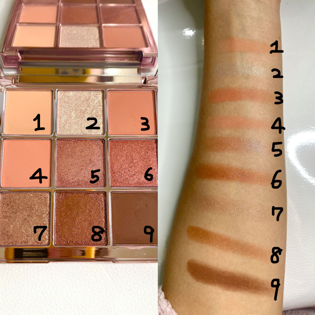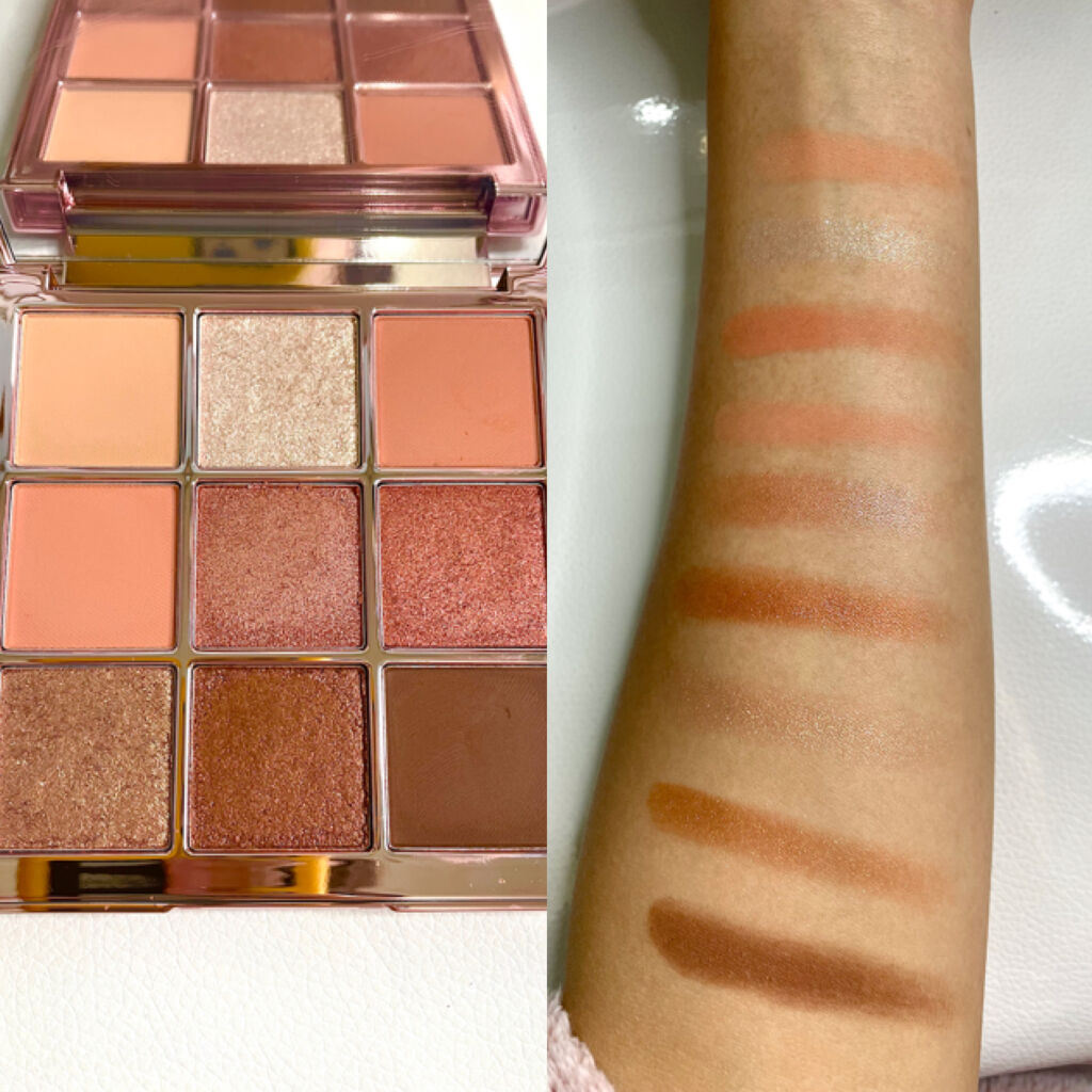 ジンジャーブラウンを基調としたアイシャドウパレット!マット、シマー、グリッターの異なる質感がバランスよく配置されて落ち着いたブラウン系やレッドがかった色味が中心。 発色が良く粉質がしっとりしていて密着度も高いです。アイシャドウだけでなくチークやシェーディングとしても使えます。 デイリー使いから特別な日のメイクまで対応できる万能パレット♪韓国コスメらしいキラキラ感も楽しめておすすめです。
