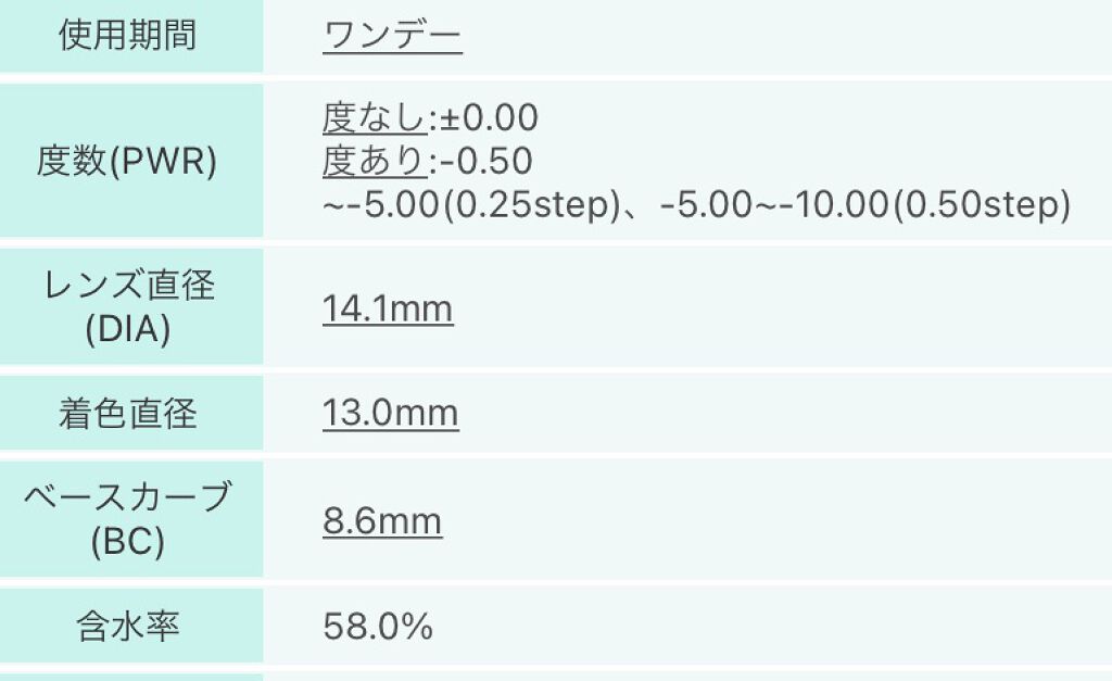 - 10~20代のイメージが強いカラーコンタクトレンズを一新し、幅広い年代の方に愛用頂ける事をコンセプトに掲げ誕生したレンズブランド。 レンズ直径14.1mmを採用し、自然な美しい瞳になれるようにデザインやイメージごとに着色直径を変えたレンズラインナップ。 度数(PWR):全30 度数 ±0.00,-0.50 -5.00(0.25step)、-5.50-10.00(0.50step) DIA14.1mm/BC8.6mm