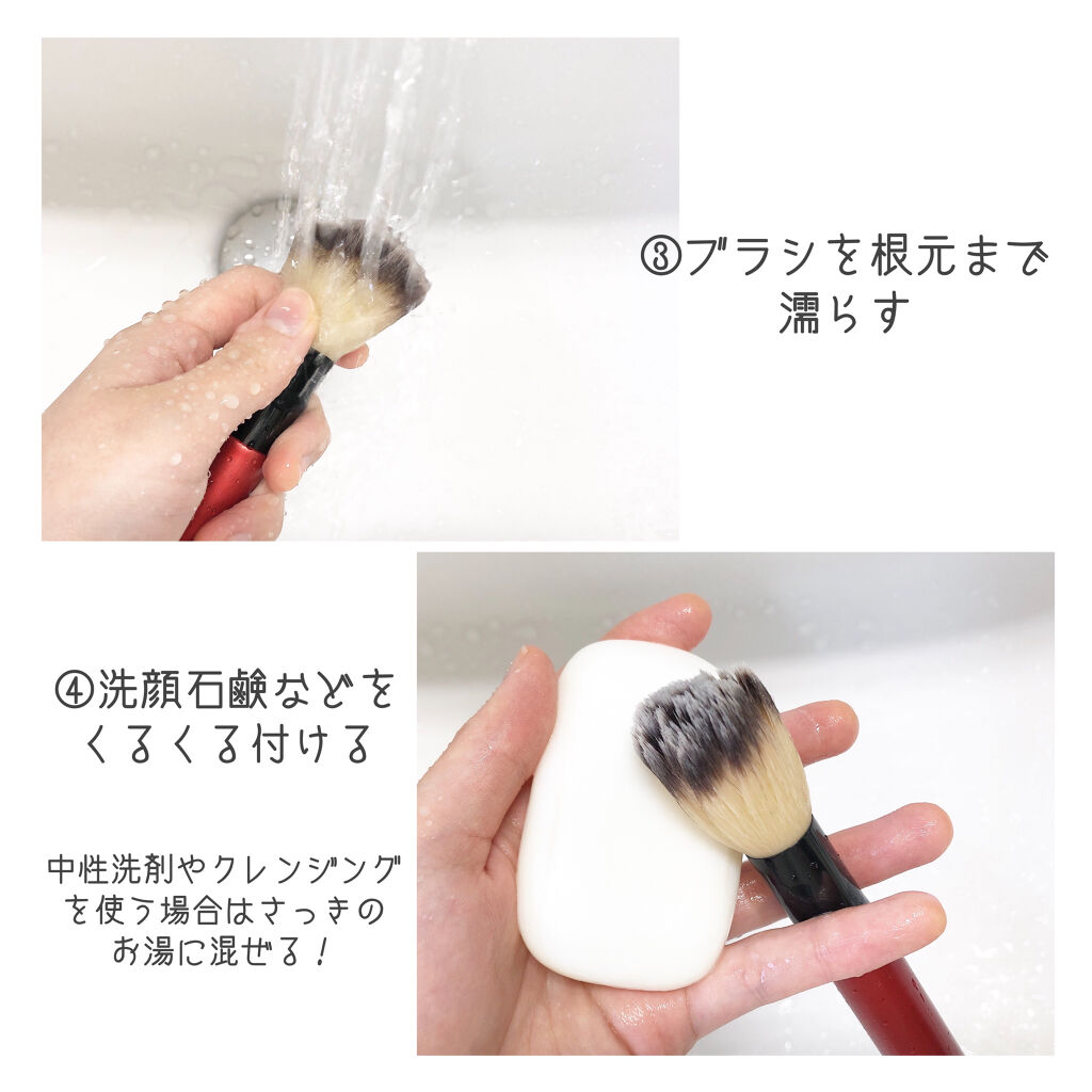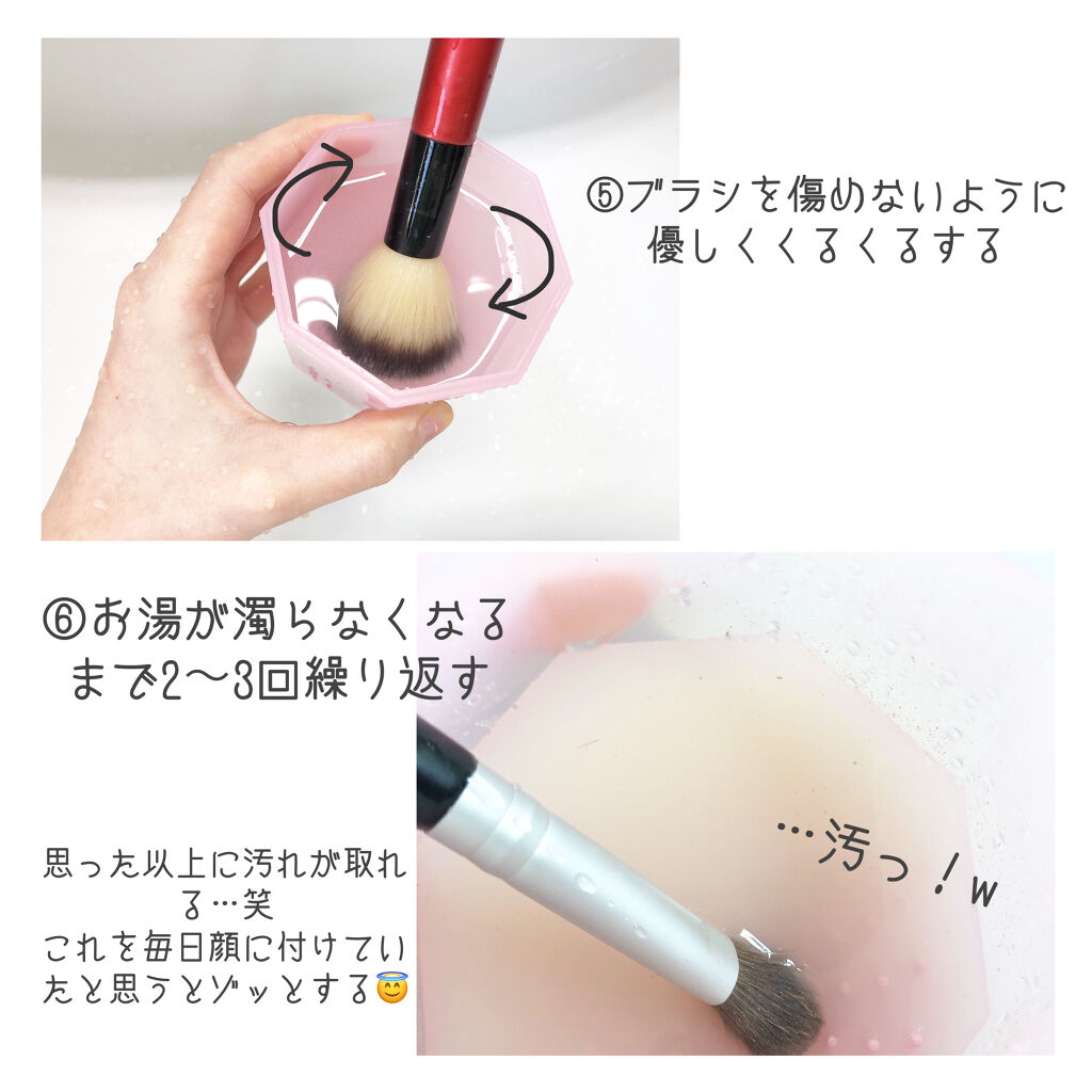 - メイクブラシの皮脂や汚れをきれいに落とします。 くるくる回すだけです。 ブラシの汚れがみるみる落ちます。 洗浄板の中央付近の小さな突起はアイブロウブラシなど毛先の短いブラシも洗えます。