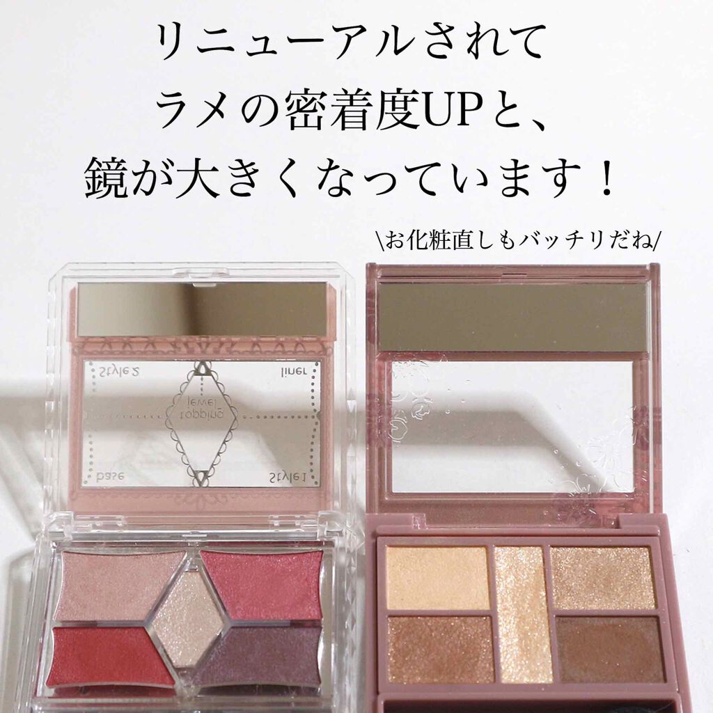 - 1枚のパレットで2つのスタイルが完成! 5色の欲ばりアイシャドウ♥ メインカラーを選んで2つのスタイルが楽しめる! A→B→D でスタイル1 A→C→D でスタイル2 繊細な粉質が、しっとりとまぶたに密着して色落ちを防ぎます。 透明感のあるキラうるトッピングジュエル(繊細ラメ)は、気分によってトッピング!