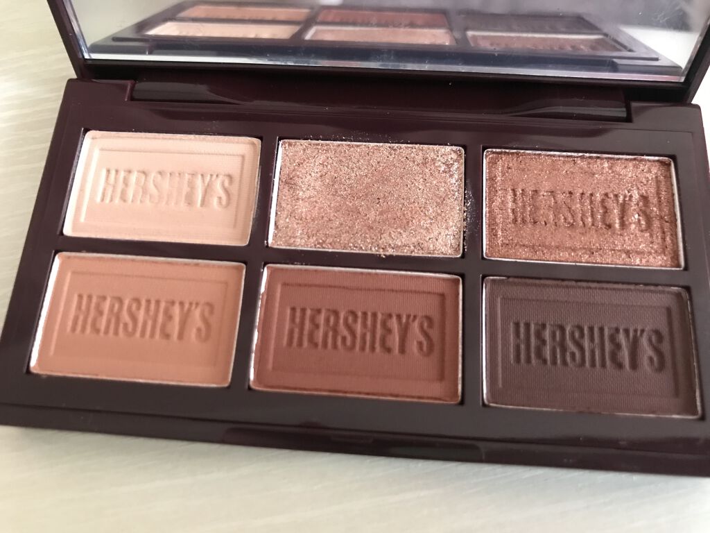 HERSHEY'Sカラーのアイパレットチョコ色のアイパレットめちゃ可愛いです!特にグリッターが綺麗で、上段列の3種類を使い切っちゃいそう!鏡も付いててサイズ感もコンパクトなので良い感じです♪(強いて言えばチップかブラシ付いてて欲しかった......