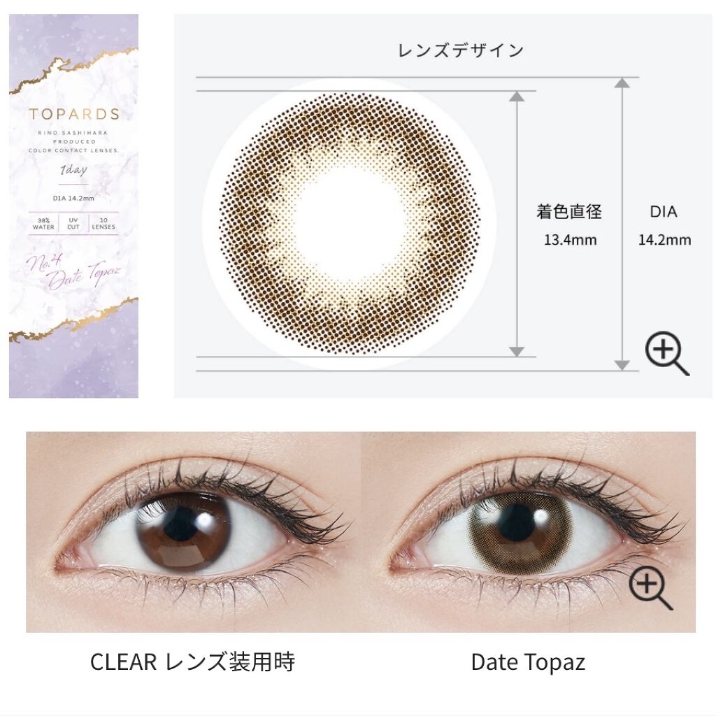 トパーズ使用カラー:ガーネット透明感のある明るめブラウンで自然な茶目になれる。体感は裸眼風サイズで普段使いしやすくて好き。デートトパーズよりこげ茶で、トパーズの中では一番自然な茶目レンズだと思ったよ!すっぴん風・ナチュラルメイクにも良き👏🏻リ...