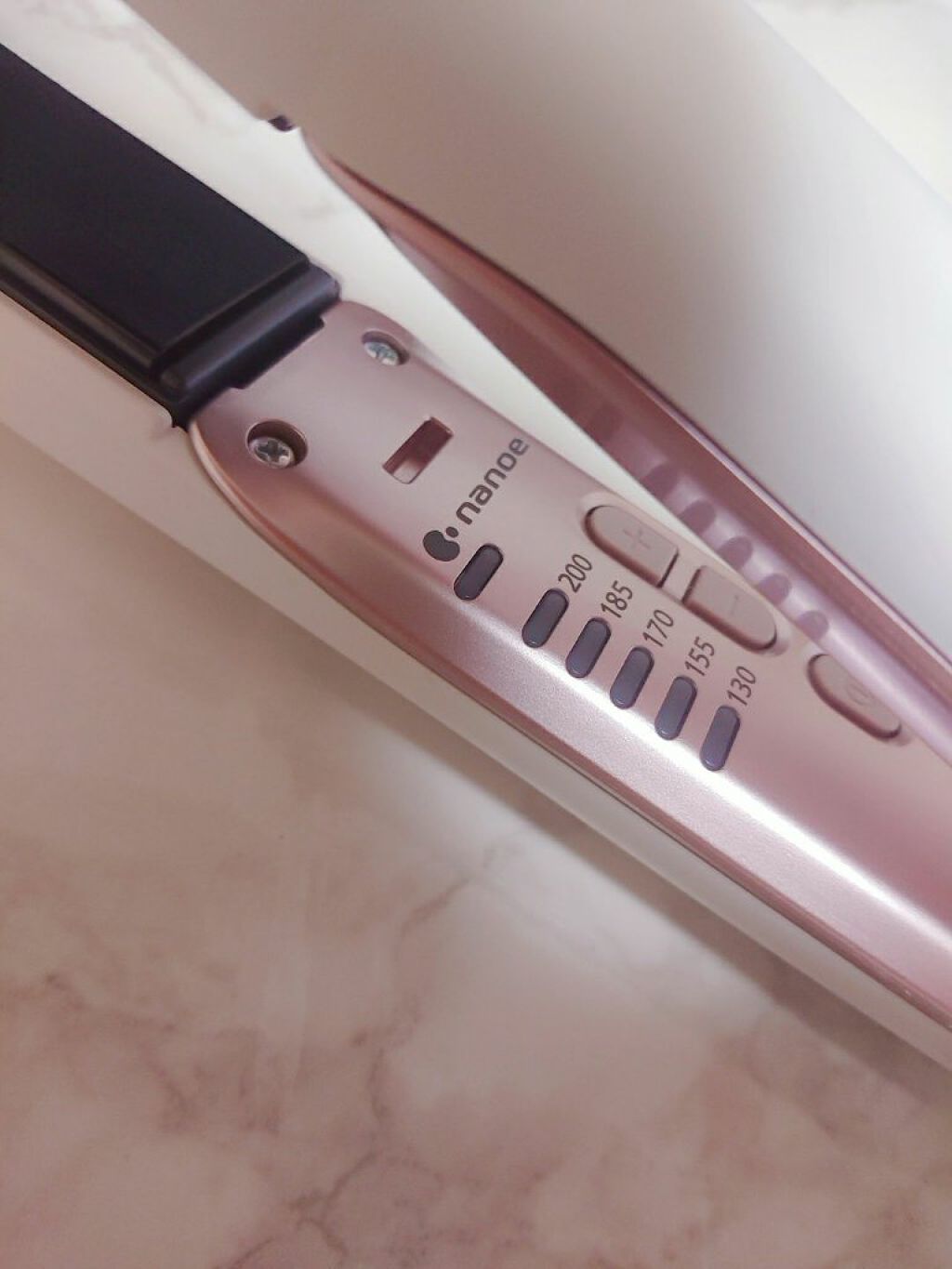 パナソニックの持つナノケアなどの技術が詰め込まれたストレートアイロン✨ 温度は5段階に調整でき、20秒で100℃まで上がるので温まるのも早いです💪 ナノケアを使用すると美容院でストレートにしてもらったときのようなサラサラの仕上がりになります!! 1回サッと通すだけでしっかり癖が解けてまっすぐな髪に仕上がるので、傷みにくいのではないかと思います🫶 仕上がりに本当に感動し、本当にお気に入りのアイテムです💕