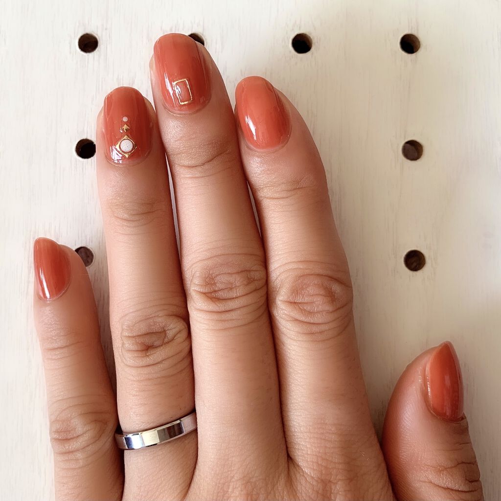 ◌パキッとした秋色もカッコよくて好きだけど透明感があってツヤツヤなカラーも見ていて癒されるから好き😌🧡.@_squseme_テラコッタミルキーキャラメル.#箔ネイル#透明感ネイル#シアーネイル#セルフネイル#艶々ネイル#ミルキーキャラメル#ベ...