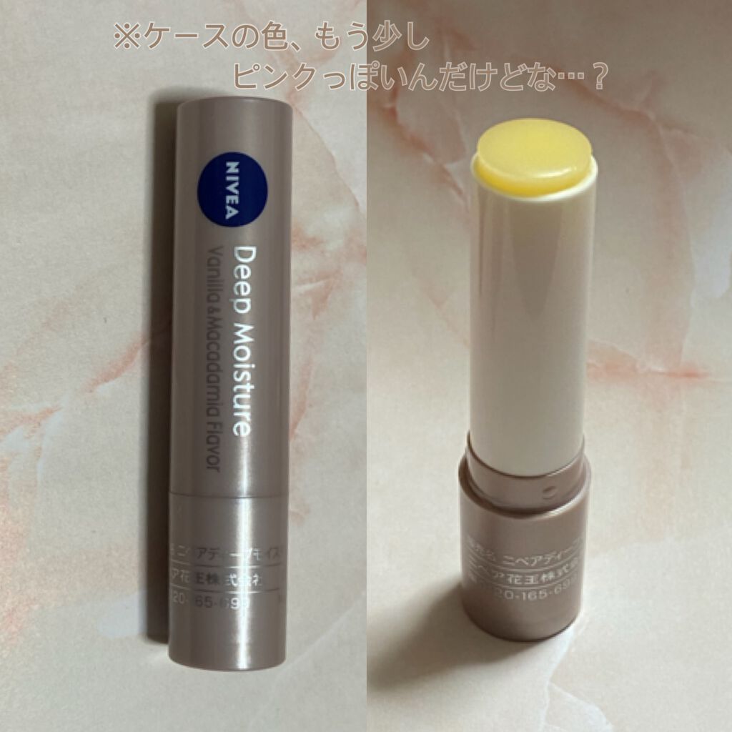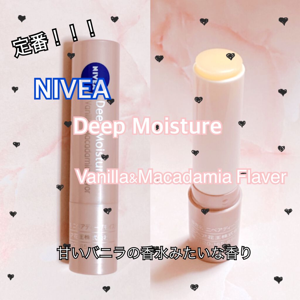 唇ふっくら、しっかり保湿力が続く♪ NIVEA DEEP Moisture SPF26 PA++ バニラ&マカデミアの香り 潤いの持続力があるから日中も唇の乾燥を気にせず過ごせるし、口紅のノリも良い感じ💄 保湿成分にはちみつ🍯やローヤルゼリーエキスが配合されてて、夜はリップパック代わりにもなる☺️
