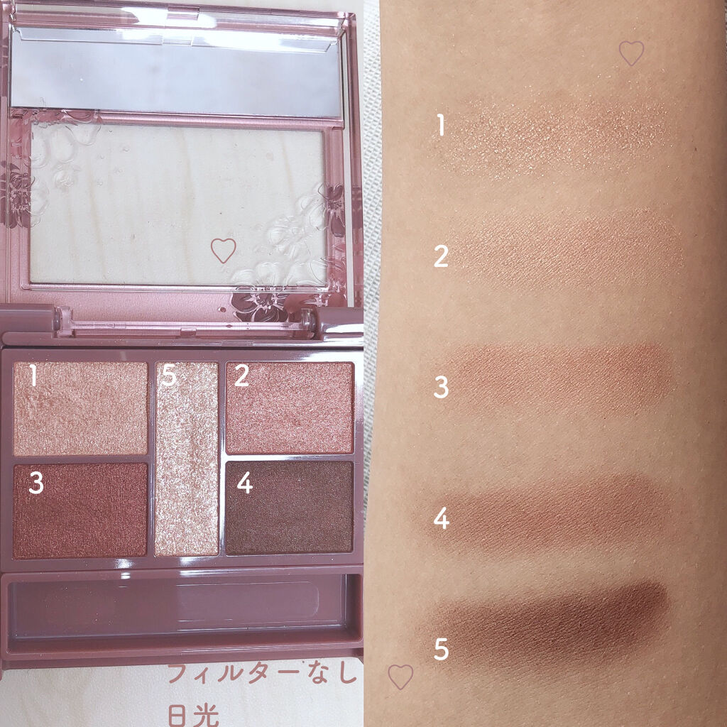 - 1枚のパレットで2つのスタイルが完成! 5色の欲ばりアイシャドウ♥ メインカラーを選んで2つのスタイルが楽しめる! A→B→D でスタイル1 A→C→D でスタイル2 繊細な粉質が、しっとりとまぶたに密着して色落ちを防ぎます。 透明感のあるキラうるトッピングジュエル(繊細ラメ)は、気分によってトッピング!