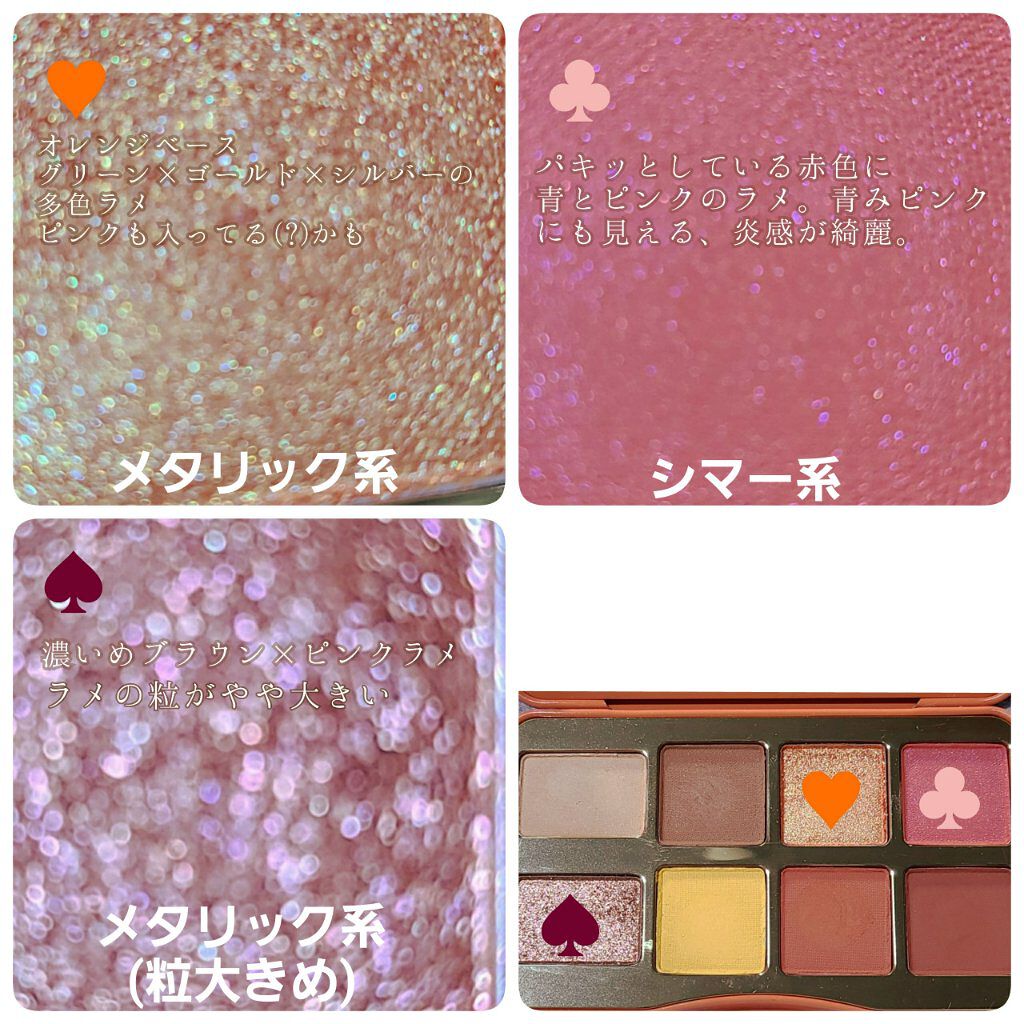 このパレット可愛すぎる🥹💗 日本から撤退してしまったToo Faced、日本で買うことが出来た最後の新作😭💕 不思議と相性の良いカラーが多い不思議なパレット🥰 青ラメや黒ラメを合わせたニュアンスカラーも楽しめるパレット💫 マットの色味も絶妙で、グラデーションにしやすくベースも作りやすい粉質✨