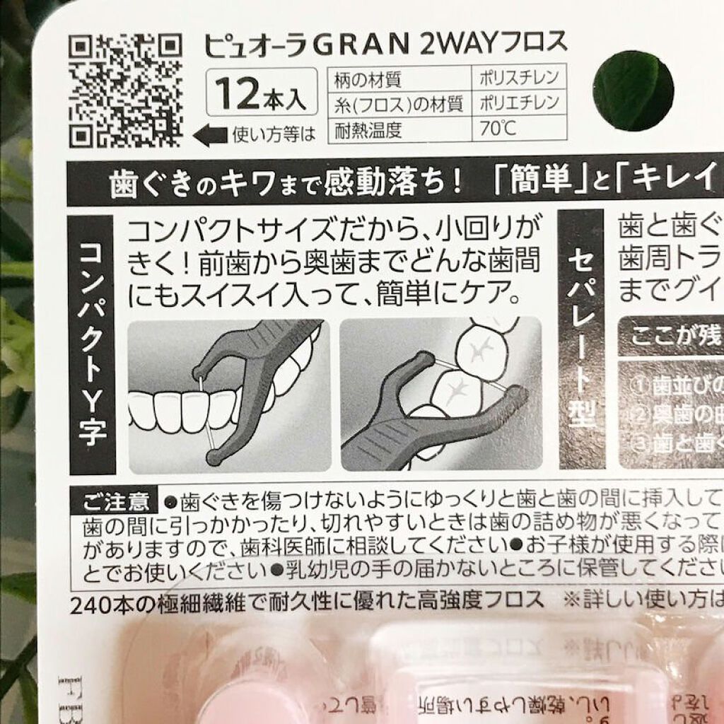 - 「ピュオーラ GRAN 2WAYフロス」は、簡単とキレイを両立。小回りがきくコンパクトサイズのY字型で、前歯から奥歯まで、どんな歯間にもスイスイ入って簡単にケアできます。また、気になるところは「セパレート型」に変身させれば、歯と歯ぐきのキワまで密着し、落とし残すと歯周トラブルの原因にもなる菌のかたまり(歯垢)まで除去します。