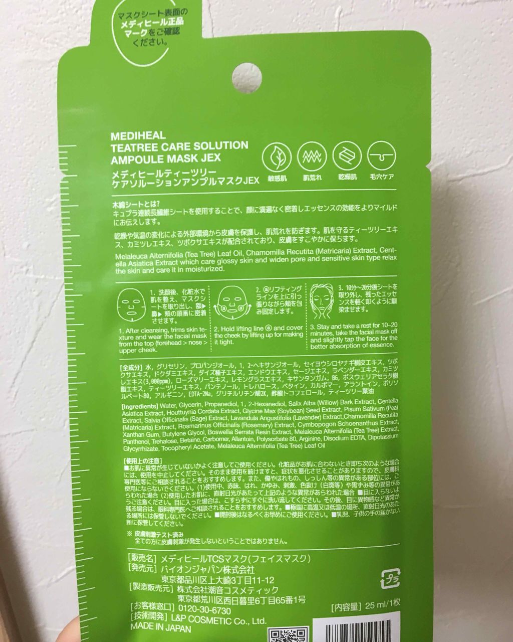 メディヒールの言わずと知れた名品。鎮静効果のあるティーツリーのフェイスマスク! 肌荒れしているときや、日焼けした後におすすめです。 使用感はさっぱりで、これだけでは保湿力が物足りないためクリームなどで蓋をすると良いと思います!