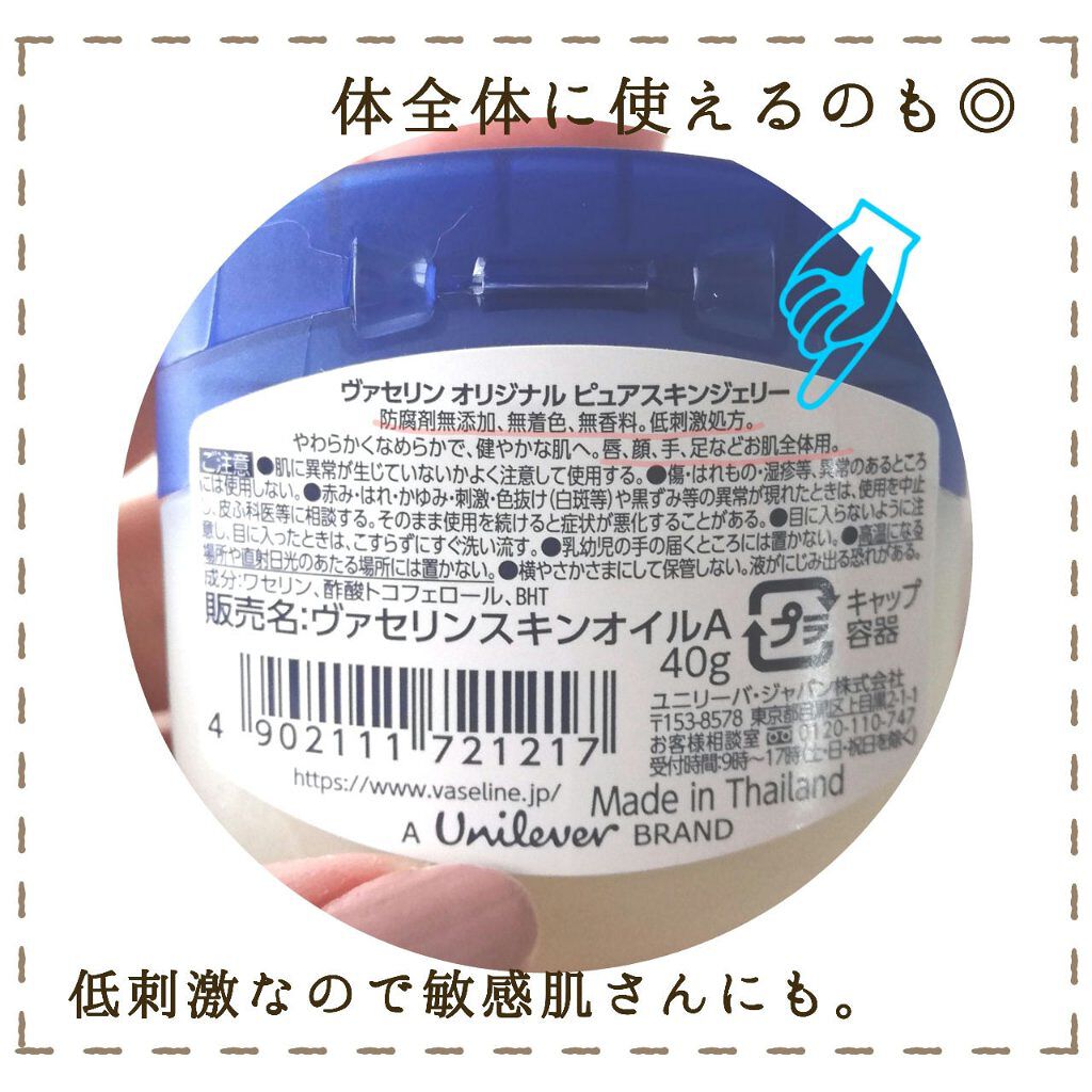 ヴァセリンオリジナルピュアスキンジェリー40g唇、顔、手、足などお肌全体用です。家にずっとあって消費しようとスキンケアで使いました。次の日肌がすべすべもっちりになってビックリしました。個人の体感で弾力のある肌になる化粧品のなかで一番安い商品で...