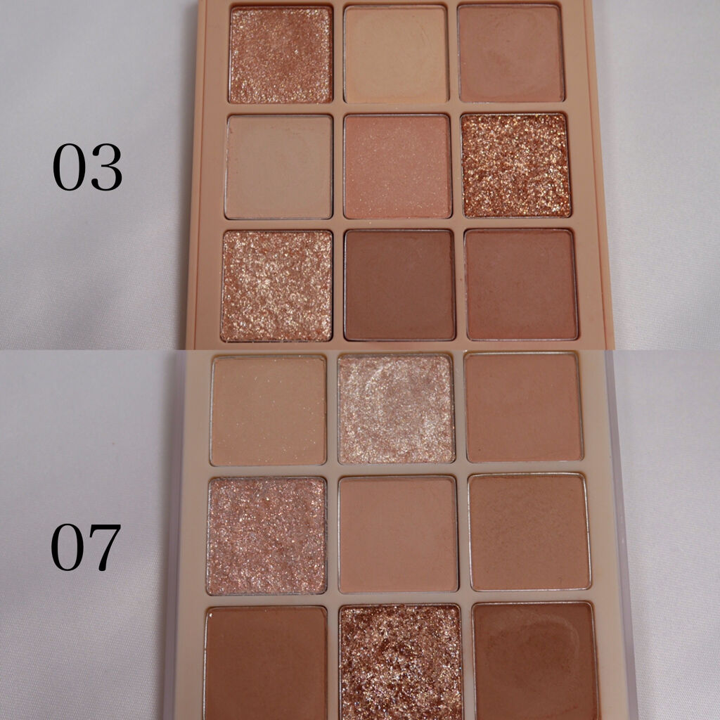 デイジークの人気の9色パレットです!マットカラーはふわっとした発色で粉質もほどよくしっとりしています。 07 Milk Latte の色は1番淡い色が揃ったパレットで、右下の1番濃いブラウン以外はとても薄い発色です。 かなりナチュラルに仕上がるのでデイリーメイクに使っています!