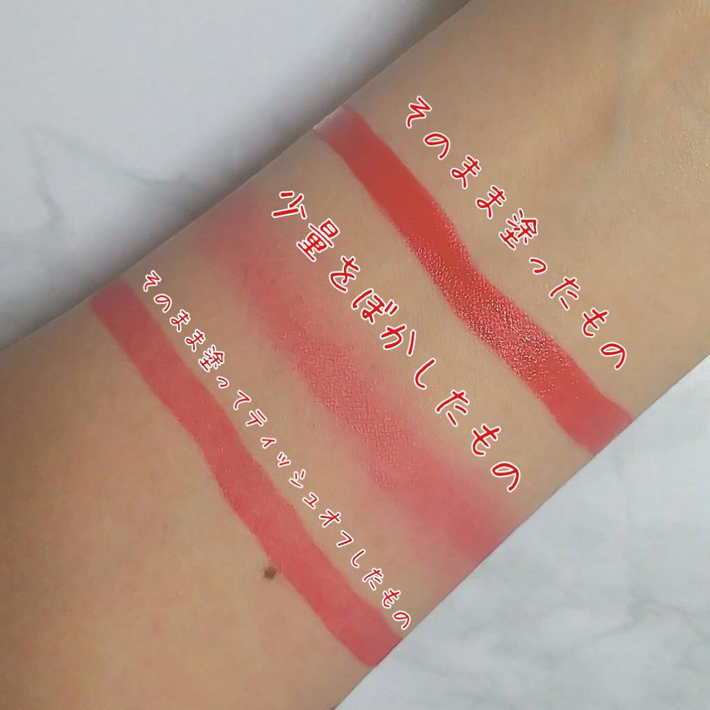 - 高発色で色持ちの良い特徴はそのままに、ひと塗りで大人っぽいマットリップが完成します。 付けた瞬間からベタツキ感のないしっとりサラサラな仕上がりです。 たっぷり塗布することで高発色のしっかりマットに、少量塗布することでふんわりソフトマットな発色の仕上がりを実現します。塗付量によって自分好みの仕上がりをお楽しみいただけます。