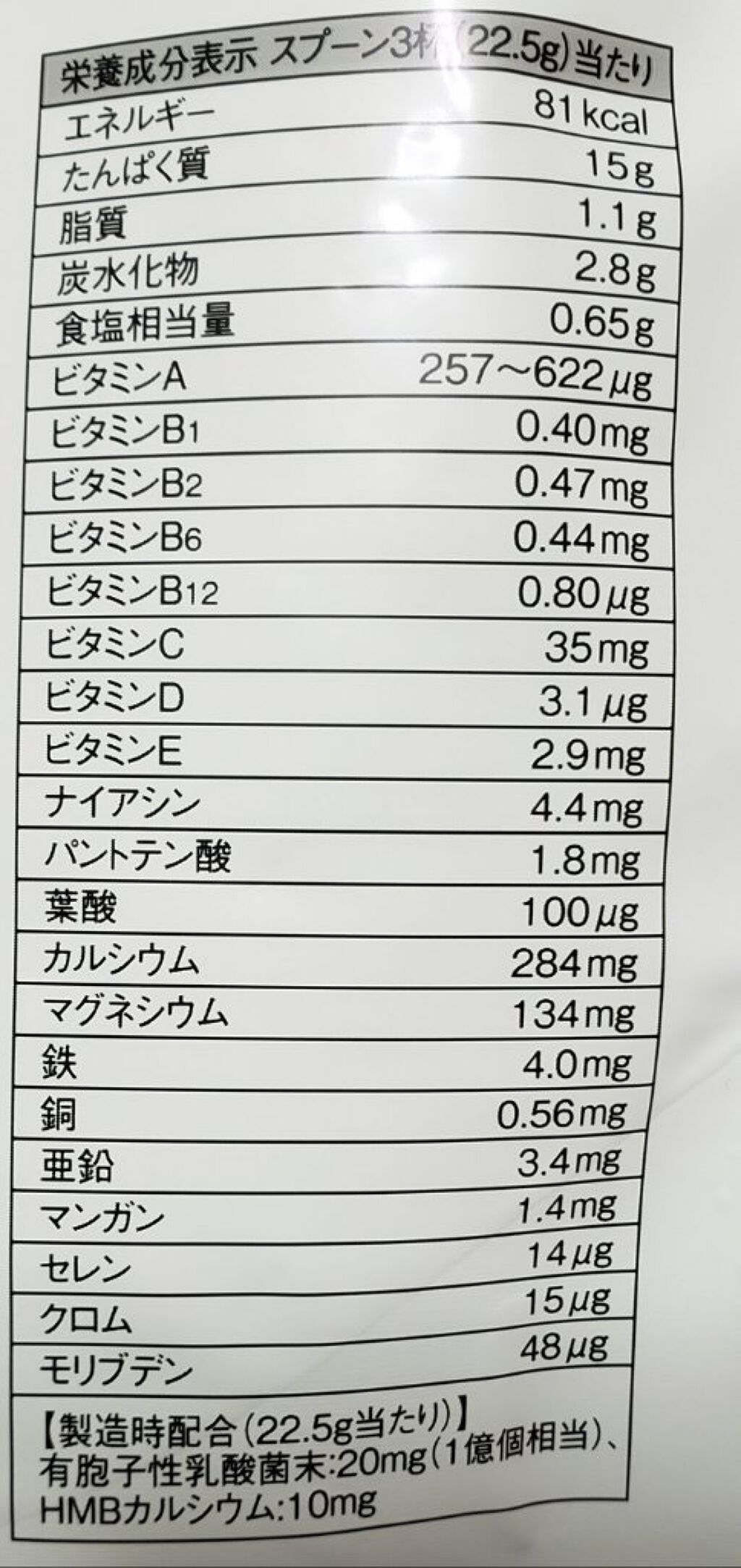 - たんぱく質だけでなく、HMBカルシウム・ビタミン11種・ミネラル9種・乳酸菌と、全23種の成分がまとめて摂れる「ディアナチュラ」ブランドのプロテインパウダーです。 1回※1当たりたんぱく質15g、ビタミン&ミネラルは1/3日分※2が摂取できます。 「たんぱく質だけでなく、ビタミンやミネラルもまとめて摂れる」「毎日続けやすいおいしさ」「スプーン1杯※3でたんぱく質が約5gと分かりやすく、調節しやすい」などが特長です。 ※1 付属スプーン3杯(約22.5g)当たり ※2 栄養素等表示基準値(18歳以上、基準熱量2200kcal)より1/3日分以上を配合 ※3 付属スプーン1杯(約7.5g)当たり