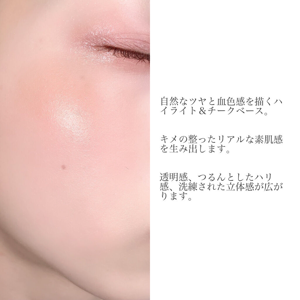 - 光を味方に。2色のツヤが描く、表情からあふれる生命感。 肌に生命感を宿らせるように、自然なツヤと血色感を描くハイライト&チークベース。 クリーミーなテクスチャーは、肌にとけこむと同時にサラッとしたパウダー状に変化し、キメの整ったリアルな素肌感を生み出します。 ハイライトカラー(右)は、光を集めて高く見せたい頬骨や鼻筋、眉骨、唇のヤマ、目頭、鎖骨に。 血色感やソフトな陰影が欲しい頬やまぶたには、ウォームカラー(左)を。 指にとり、ファンデーションの上からベースメイクの仕上げにプラスするだけで、想像以上の透明感、つるんとしたハリ感、洗練された立体感が、瞬く間に表情へ広がります。