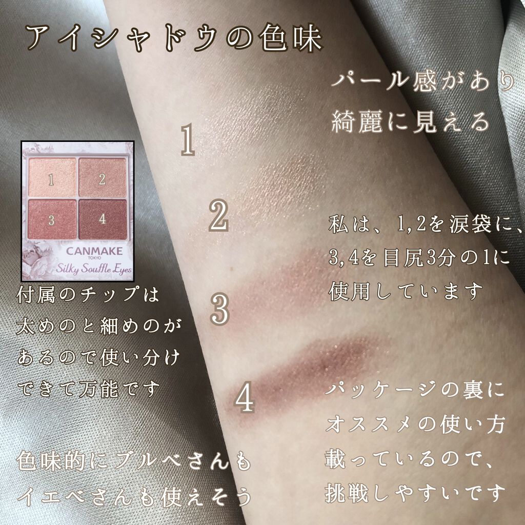 キャンメイクシルキースフレアイズマットタイプM04キューピッドペタル¥825◇質感(マット3、小粒ラメ1)質感はマットですがふわっとしていて透け感があるので色を重ねても重くなったり濁ったりしないのが特徴です◎ラメは小粒ですが思った以上にキラッ...