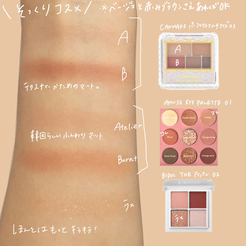 キャンメイク プティパレットアイズ 04 アマンドブリュレ ¥1,078 弱めベーシックにアイメイクしたくてマットカラーメインに使いました 淡めに乗せたのでアイラインとラメを少し乗せて調整しています