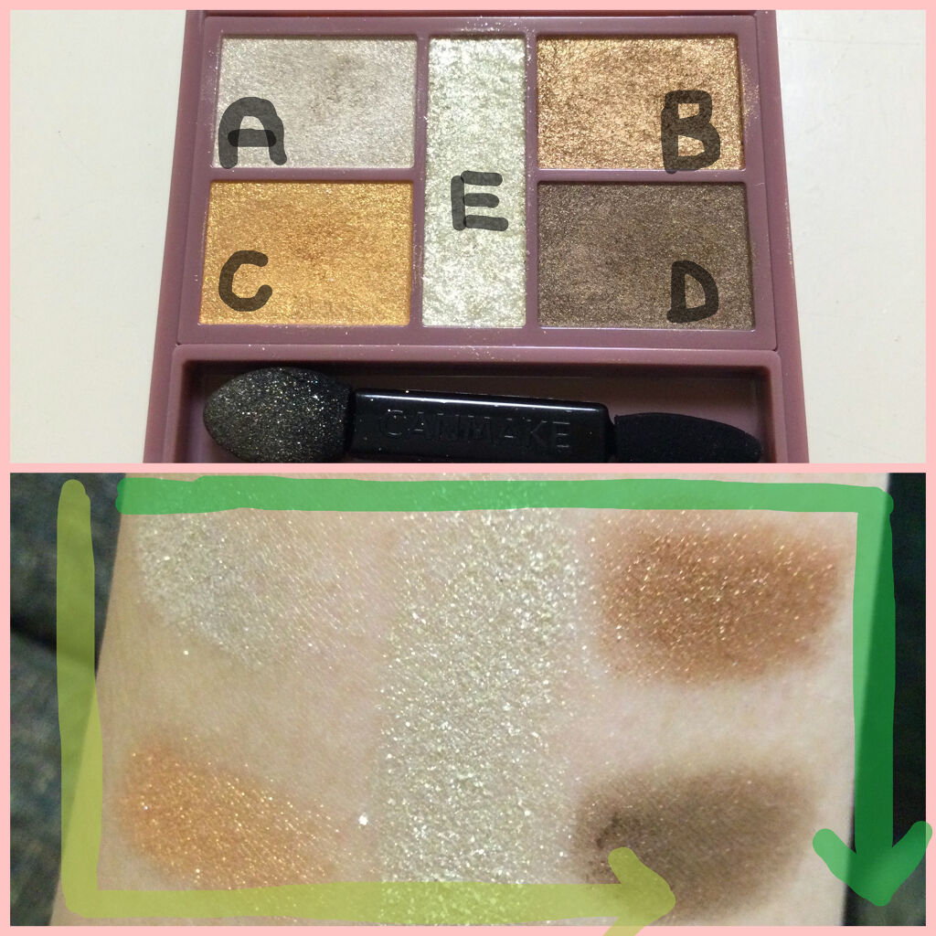 - 1枚のパレットで2つのスタイルが完成! 5色の欲ばりアイシャドウ♥ メインカラーを選んで2つのスタイルが楽しめる! A→B→D でスタイル1 A→C→D でスタイル2 繊細な粉質が、しっとりとまぶたに密着して色落ちを防ぎます。 透明感のあるキラうるトッピングジュエル(繊細ラメ)は、気分によってトッピング!