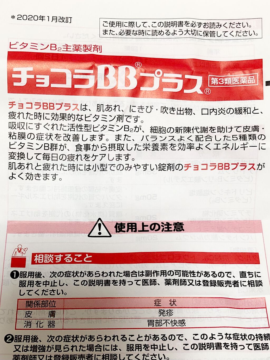 - 成人1日量2錠中 成分・・・含量・・・働き リボフラビンリン酸エステルナトリウム(ビタミンB2リン酸エステル)・・・38mg ピリドキシン塩酸塩(ビタミンB6)・・・50mg チアミン硝化物(ビタミンB1硝酸塩)・・・20mg ニコチン酸アミド・・・40mg パントテン酸カルシウム・・・20mg [添加物] タルク、炭酸Ca、トウモロコシデンプン、ヒドロキシプロピルセルロース、 D-マンニトール、アラビアゴム、カルナウバロウ、酸化チタン、三二酸化鉄、 ステアリン酸、ステアリン酸Mg、セラック、セルロース、二酸化ケイ素、白糖、 ビタミンB2、ヒプロメロース、プルラン、ポビドン、マクロゴール、リン酸水素Ca