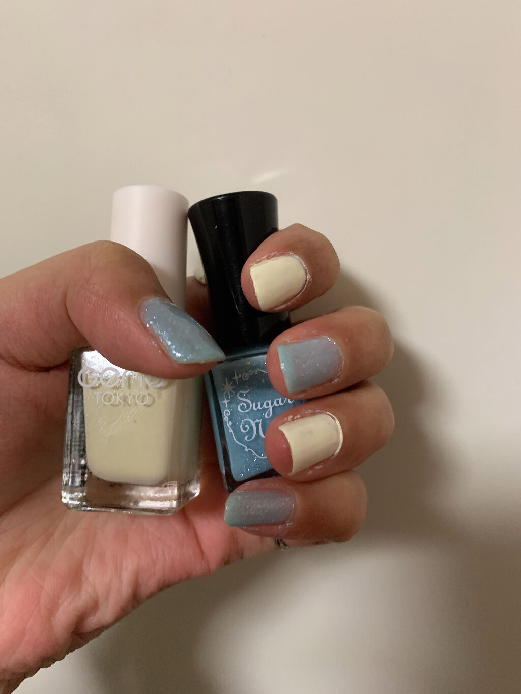 【ネイル投稿】今回は初めてネイルチップを使用したネイルを紹介したいと思います❕もう冬も終わりなのに冬ネイルです(`・ω・´)やり方↓親指、中指、小指1.白のネイルを全体に2度塗りします2.水色のネイルを3分の2に塗ります(この時1度塗りでも2...