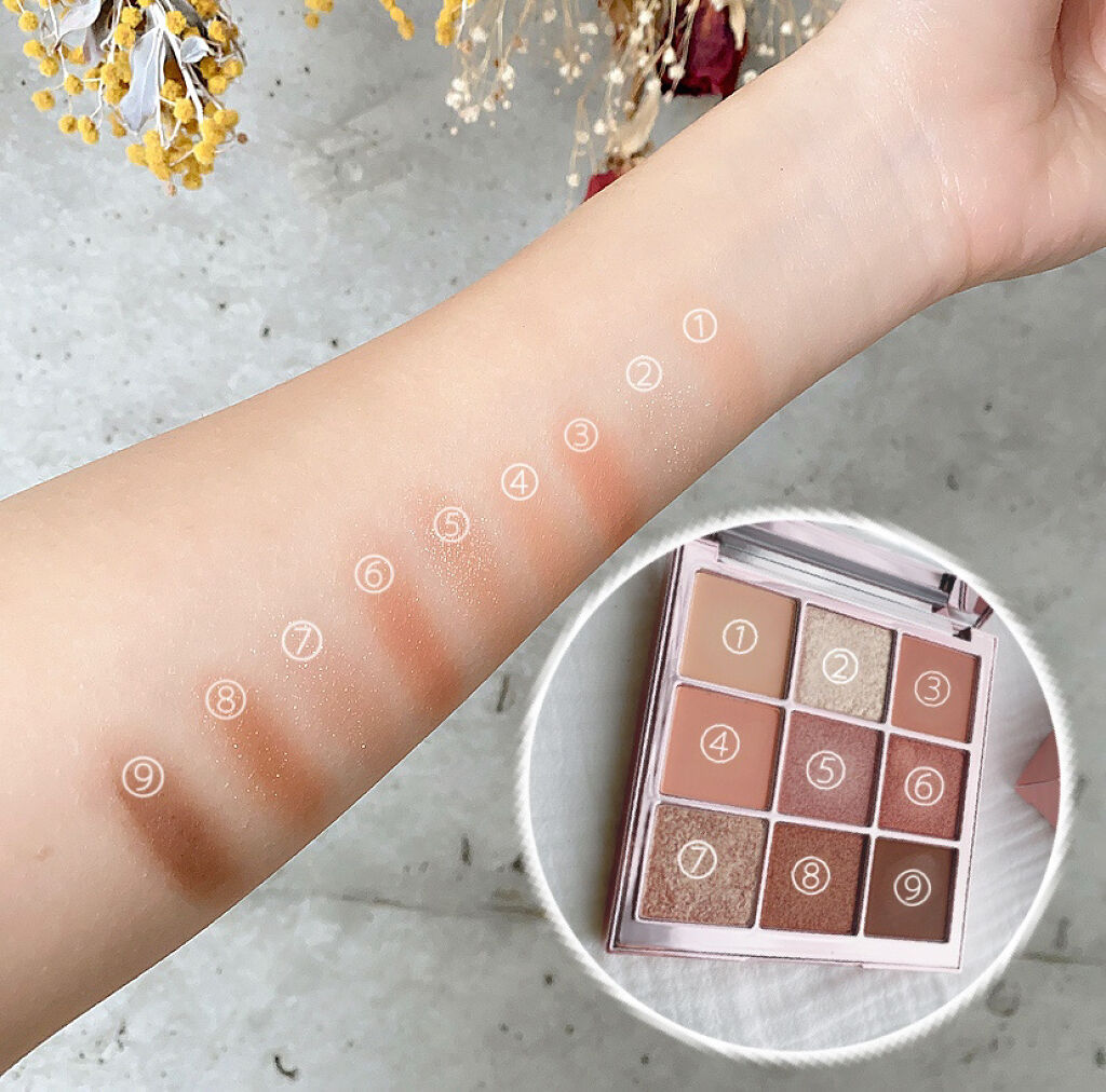 ジンジャーブラウンを基調としたアイシャドウパレット!マット、シマー、グリッターの異なる質感がバランスよく配置されて落ち着いたブラウン系やレッドがかった色味が中心。 発色が良く粉質がしっとりしていて密着度も高いです。アイシャドウだけでなくチークやシェーディングとしても使えます。 デイリー使いから特別な日のメイクまで対応できる万能パレット♪韓国コスメらしいキラキラ感も楽しめておすすめです。