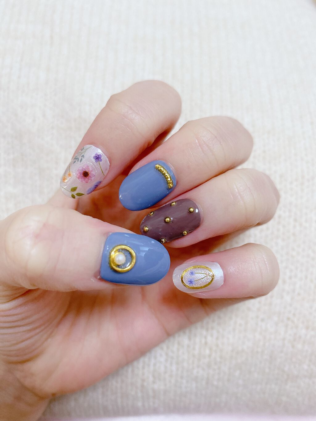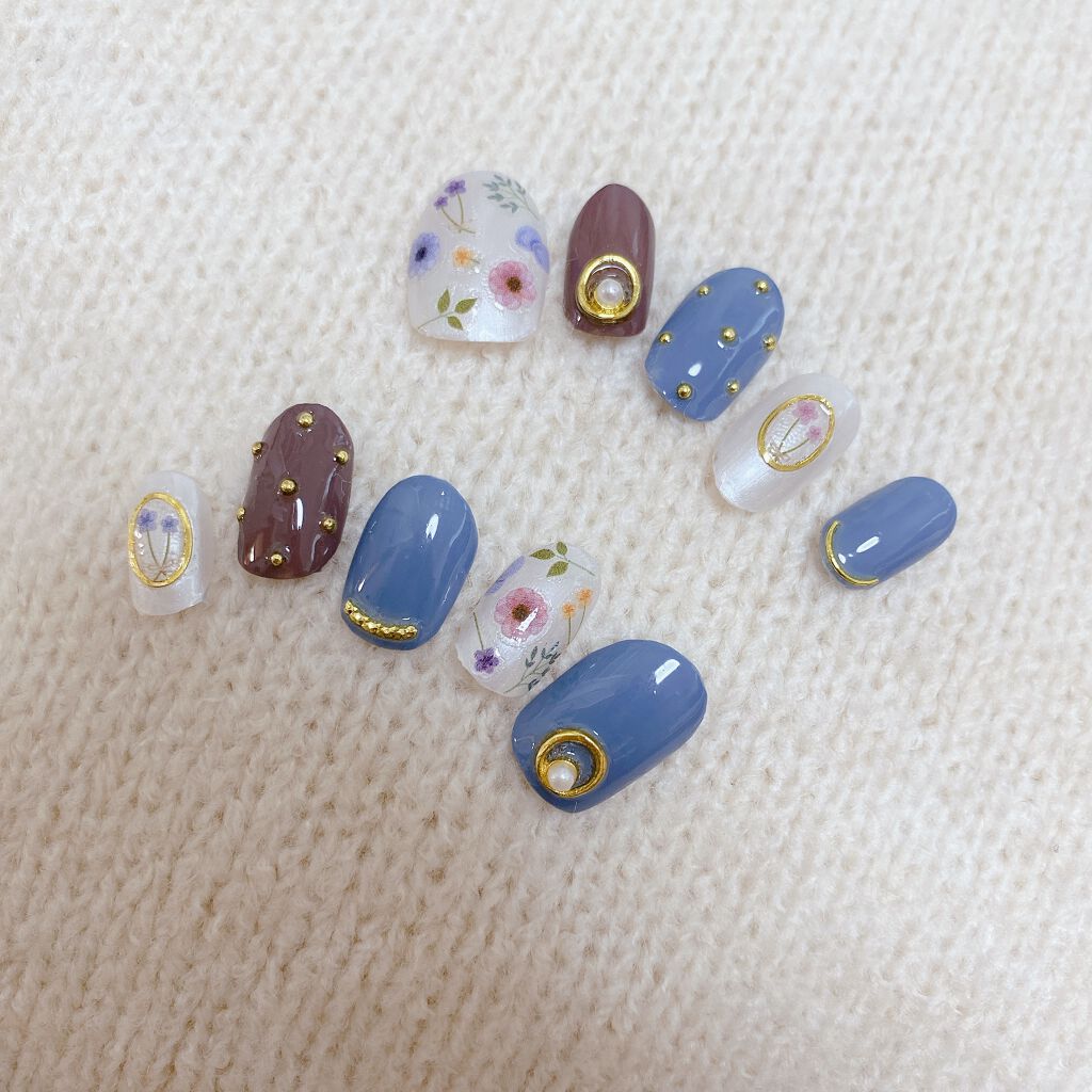 小花柄ネイル🌼花といえば春!って感じですがまだまだ寒い冬が続いています....🥶今回は冬〜春にかけて映えそうなネイルにしてみました。ポイントは寒色(今回はブルー)を間に入れて寒い感じ(冬っぽさ?)を残したところです!寒色じゃなくても、ピンクな...