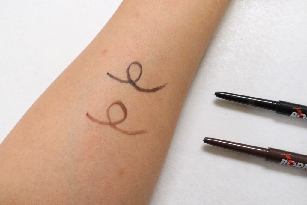 どちらも発色が良くしっかりと色が出て ペンシルは柔らかめで滑らかな描きごこち🎶 何よりすごいのは擦っても落ちないし ウォータープルーフで滲みません🥺 結構柔らかめで折れやすいので 短めに使うと描きやすいです👌🏻 ちょっと落ちにくかったので落とすのは少し 大変でしたが長時間お化粧している方や 水場ではオススメです❣️