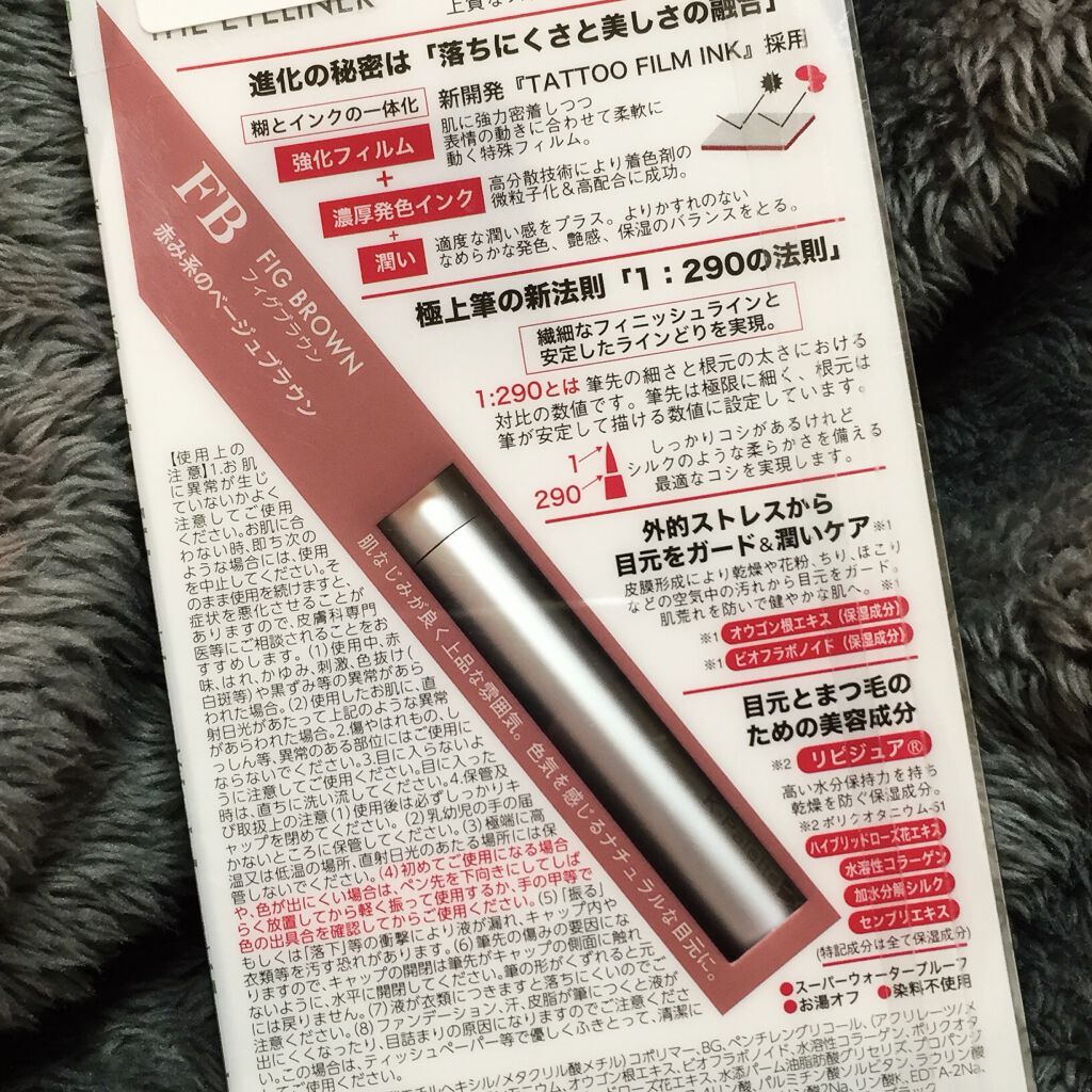 - 新処方「TATTOO FILM INK(タトゥーフィルムインク)」採用で、かすれ・色むらのない美発色・高発色ラインを長時間キープします。さらに、極上筆の新法則「1:290の法則」により、繊細なフィニッシュラインと安定した描き心地を実現しました。「落ちにくいコスメ」のその先を追求した、落ちにくさと美しさを兼ね備えた一歩先ゆく新アイライナーです。