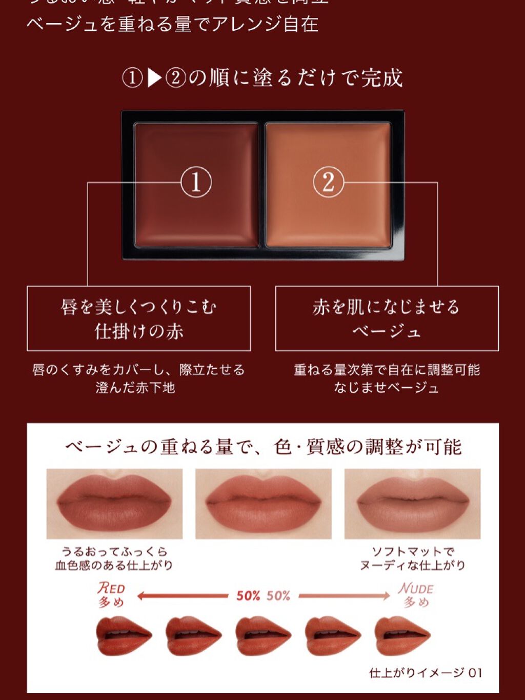 - 赤い下地にヌードカラーを重ねて自在に自分にぴったりのカラーをつくれる、とろける感触の2色セットのクリームルージュ。 澄んだカラーとうるおい感、とろける感触を実現するバーム由来処方。 唇のくすみをカバーし、際立たせる澄んだ赤い下地と、重ねる量次第で自在に調整可能のなじませヌードカラーの2色セット。 ミラー付きコンパクトケース入りで、細かくも広くも塗りやすいリップチップ付き。 2020/2/1先行発売