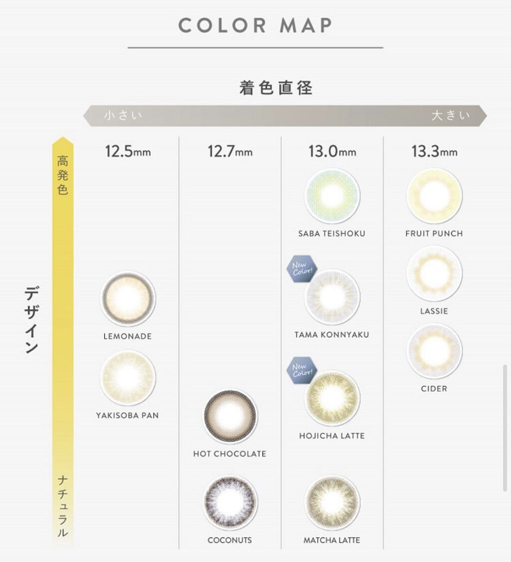 - ※2025年6月以降、商品パッケージ裏面・側面の一部表記を順次変更いたします。尚、これにかかる商品の交換・返品は承っておりません。 「大きく見せる」「盛る」といった従来の視点だけではなく、メイクと合わせることでより魅力的な印象をつくる“メイクを引き立たせるカラコン”をコンセプトにレンズを開発。 プロデューサーである渡辺直美さんが発信するトレンドのしっかりメイクに合うレンズデザインから、日常的なナチュラルメイクに合うデザインまで、さまざまなメイクを引き立てる11種類のレンズを展開します。 カラーコンタクトレンズの不適正使用による眼障害の危険性等などがあります。 ●コンタクトレンズは高度管理医療機器です。不十分な洗浄・消毒など不適切なケアや、長時間・交換期間を超えた装用により、アレルギー性結膜炎、角膜感染症、角膜潰瘍等の重篤な眼障害が発生する危険性があります ●ご使用前に取扱説明書を確認してください 使用上の留意事項 ●眼科医院等を受診してからお求めください ●眼に異常を感じたら直ちにレンズ使用を中止し、お近くの眼科等で診察を受けてください ●医師の指示にしたがってご使用ください ●コンタクトレンズを装用する場合、自覚症状がなくても、眼科医院等での定期検査を受けてください ●レンズに不具合がある場合は使用しないでください