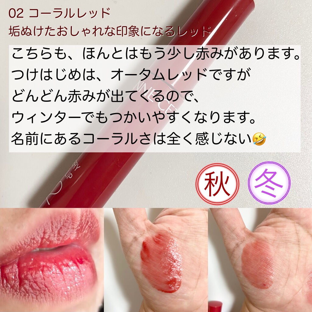 | 乾燥しにくく、艶感をキープしてくれて、ティント特有の色持ちも良く、ぷるっとしたジューシーな唇に仕上がります | 詳細を見る | |