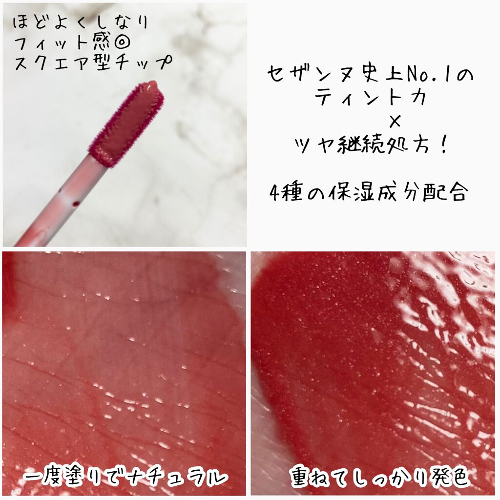 - ツヤ×色×潤いをキープする、セザンヌの新濡れツヤリップ みずみずしい濡れツヤ感ある仕上がりで、発色とツヤが長続きするティントリップです。ティントの発色を透明のベールで覆うリップコートのような処方で、ツヤ感と色をキープします。さらに、唇表面のべたつきは少なく、しっとり潤うオイルinウォーター処方を採用しています。