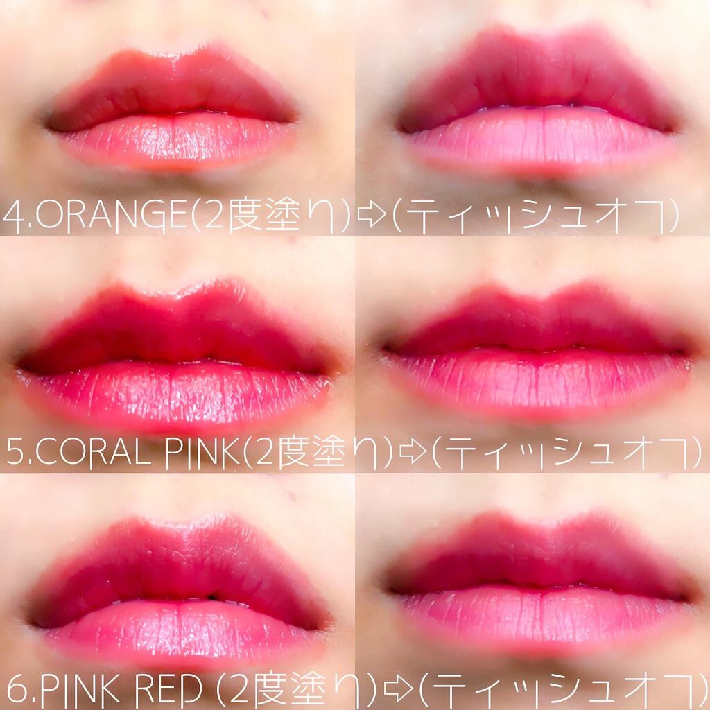 多幸感あふれるクリアなコーラル🩷 特に時間が経つと蛍光感がでてきちゃう。 THEピンクのリップを求めている人にピッタリ! ティッシュオフしても若干色は残ってる! おすすめの塗り方は、いつもよりも少し濃いめに塗ってから、ティッシュオフ!
