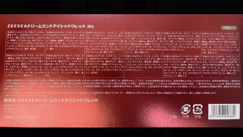- <01 ハートの女王> [01] タルク、マイカ、シリカ、水添ポリイソブテン、ステアリン酸Mg、酸化チタン、パルミチン酸エチルヘキシル、ジメチコン、グンジョウ、酢酸トコフェロール、ポリブテン、1,2-ヘキサンジオール、ペンチレングリコール、PG、ヒドロキシアセトフェノン、黄4、赤202 [02] マイカ、シリカ、ビスジグリセリルポリアシルアジペート-2、水添ポリイソブテン、窒化ホウ素、ステアリン酸Mg、酢酸トコフェロール、1,2-ヘキサンジオール、ペンチレングリコール、PG、ヒドロキシアセトフェノン、黄4 [03] ワセリン、ジメチコン、アクリレーツコポリマー、パルミチン酸エチルヘキシル、水添ポリイソブテン、ポリブテン、テトライソステアリン酸ペンタエリスリチル、酢酸トコフェロール、1,2-ヘキサンジオール、ペンチレングリコール、PG、ヒドロキシアセトフェノン、Al、黄4、PET [04] タルク、ジメチコン、合成フルオロフロゴパイト、テトライソステアリン酸ペンタエリスリチル、酸化チタン、ステアリン酸Mg、酸化鉄、ホウケイ酸‘(Ca/Na)、酢酸トコフェロール、1,2-ヘキサンジオール、ペンチレングリコール、PG、ヒドロキシアセトフェノン、黄4、酸化スズ [05] マイカ、タルク、ジメチコン、合成フルオロフロゴパイト、酸化鉄、ステアリン酸Mg、テトライソステアリン酸ペンタエリスリチル、酢酸トコフェロール、1,2-ヘキサンジオール、ペンチレングリコール、PG、ヒドロキシアセトフェノン [06] マイカ、タルク、シリカ、水添ポリイソブテン、パルミチン酸エチルヘキシル、酸化チタン、ジメチコン、酸化鉄、ポリブテン、酢酸トコフェロール、1,2-ヘキサンジオール、ペンチレングリコール、PG、ヒドロキシアセトフェノン、グンジョウ、黄4、赤202 [07] マイカ、ジメチコン、シリカ、水添ポリイソブテン、パルミチン酸エチルヘキシル、酸化チタン、酸化鉄、ポリブテン、酢酸トコフェロール、1,2-ヘキサンジオール、ペンチレングリコール、PG、ヒドロキシアセトフェノン、赤202 [08] タルク、マイカ、シリカ、ジメチコン、テトライソステアリン酸ペンタエリスリチル、酸化鉄、酢酸トコフェロール、1,2-ヘキサンジオール、ペンチレングリコール、PG、ヒドロキシアセトフェノン [09] タルク、ジメチコン、合成フルオロフロゴパイト、窒化ホウ素、テトライソステアリン酸ペンタエリスリチル、ステアリン酸Mg、酸化チタン、ホウケイ酸(Ca/Na)、酢酸トコフェロール、1,2-ヘキサンジオール、ペンチレングリコール、PG、ヒドロキシアセトフェノン、酸化スズ [10] タルク、マイカ、ジメチコン、テトライソステアリン酸ペンタエリスリチル、酸化チタン、酸化鉄、ステアリン酸Mg、ホウケイ酸(Ca/Na)、酢酸トコフェロール、1,2-ヘキサンジオール、ペンチレングリコール、PG、ヒドロキシアセトフェノン、酸化スズ、赤202 <02 アリス> [01] タルク、合成フルオロフロゴパイト、ジメチコン、水添ポリイソブテン、テトライソステアリン酸ペンタエリスリチル、窒化ホウ素、酸化チタン、ジメチコンクロスポリマー、フェニルトリメチコン、ホウケイ酸(Ca/Na)、酸化鉄、グンジョウ、酢酸トコフェロール、1,2-ヘキサンジオール、ペンチレングリコール、PG、ヒドロキシアセトフェノン、酸化スズ [02] マイカ、シリカ、水添ポリイソブテン、ジメチコン、窒化ホウ素、パルミチン酸エチルヘキシル、ポリブテン、酸化鉄、酸化チタン、酢酸トコフェロール、1,2-ヘキサンジオール、ペンチレングリコール、PG、ヒドロキシアセトフェノン、黄4 [03] ワセリン、ジメチコン、アクリレーツコポリマー、パルミチン酸エチルヘキシル、水添ポリイソブテン、ポリブテン、テトライソステアリン酸ペンタエリスリチル、グンジョウ、酢酸トコフェロール、1,2-ヘキサンジオール、ペンチレングリコール、PG、ヒドロキシアセトフェノン、Al、PET [04] マイカ、ジメチコン、タルク、合成フルオロフロゴパイト、テトライソステアリン酸ペンタエリスリチル、酸化チタン、ホウケイ酸(Ca/Na)、コンジョウ、酢酸トコフェロール、1,2-ヘキサンジオール、ペンチレングリコール、PG、ヒドロキシアセトフェノン、黄4、青1、酸化スズ [05] マイカ、タルク、ジメチコン、合成フルオロフロゴパイト、テトライソステアリン酸ペンタエリスリチル、酸化チタン、酸化鉄、酢酸トコフェロール、1,2-ヘキサンジオール、ペンチレングリコール、PG、ヒドロキシアセトフェノン、酸化スズ [06] タルク、マイカ、シリカ、窒化ホウ素、ジメチコン、テトライソステアリン酸ペンタエリスリチル、酸化鉄、グンジョウ、酢酸トコフェロール、酸化クロム、1,2-ヘキサンジオール、ペンチレングリコール、PG、ヒドロキシアセトフェノン、青1 [07] マイカ、ジメチコン、シリカ、窒化ホウ素、テトライソステアリン酸ペンタエリスリチル、酸化チタン、カオリン、ステアリン酸Mg、酸化鉄、酢酸トコフェロール、1,2-ヘキサンジオール、ペンチレングリコール、PG、ヒドロキシアセトフェノン