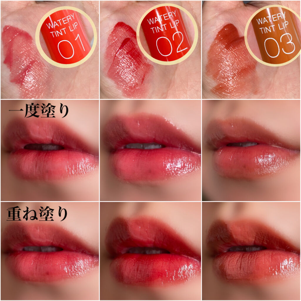 CEZANNEのウォータリーティントリップから新色が出た〜(*˘︶˘*).。.:*♡ということで全色スウォッチいってみたいと思います🙌🏻💕濡れたようなツヤが長時間持続するティントルージュ。水に濡れたような軽やかなツヤが持続✨唇に色がフィットし...