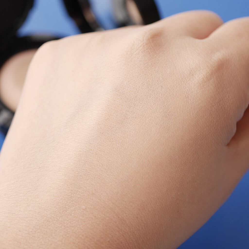 弾力のある“生ぷにっ質感”が特徴。ゲルを採用していて、ぷにぷに気持ちイイ❤ 肌への密着度が高く、ぴたっとフィットする。なのに、肌に伸ばすと素早くサラサラに! オイルとたっぷりの微細パール配合で、パウダーでは表現できない生っぽい艶感が✨ 透け感のあるアプリコット系のカラーで、誰にでも合いそうな色味。 10種の美容保湿成分配合で、乾燥も感じなかった。