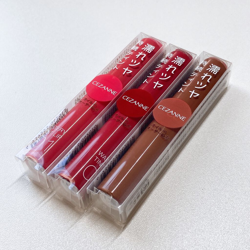 - ツヤ×色×潤いをキープする、セザンヌの新濡れツヤリップ みずみずしい濡れツヤ感ある仕上がりで、発色とツヤが長続きするティントリップです。ティントの発色を透明のベールで覆うリップコートのような処方で、ツヤ感と色をキープします。さらに、唇表面のべたつきは少なく、しっとり潤うオイルinウォーター処方を採用しています。