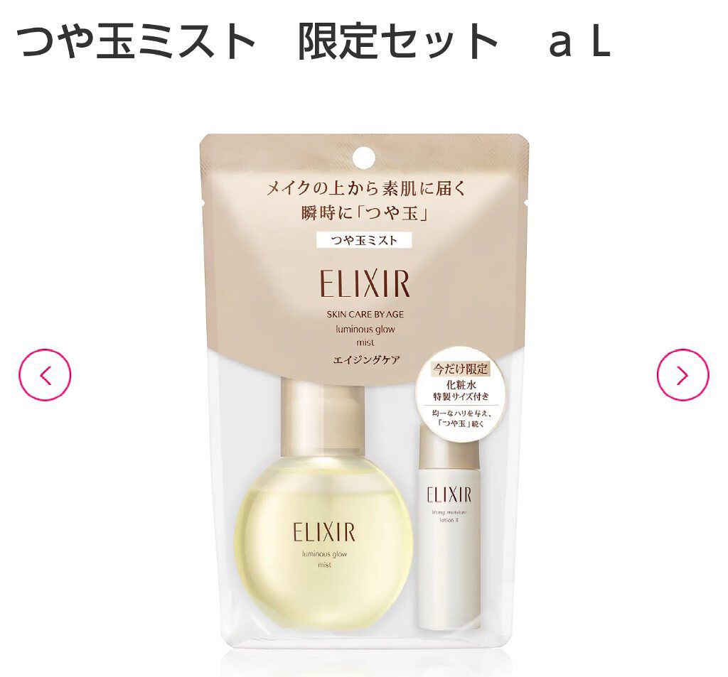 - エリクシール エイジングケア※5 メイクの上から素肌に届く。瞬時に「つや玉」。 ※5 エイジングケアとは、年齢に応じたうるおいケアです。 ○きめ細かいミストが、メイクの上からも、たっぷりのうるおいとなめらかで均一なハリを与え、瞬時に「つや玉」が輝く肌へ -厳選成分 クレソンエキスBG オランダカラシエキス、1,3-ブチレングリコール(保湿) -独自成分 イノシトールCP イノシット、酵母エキス(3)、グリセリン(保湿) -コラーゲンGL高濃度配合※6 ※6 エリクシールシュペリエル シリーズ比 水溶性コラーゲン、グリセリン(保湿) ○美容水層と美容オイル層が混ざり合い、メイクを崩さず肌のすみずみまでうるおいで満たします ○明るくリフレッシュした気分を演出する、みずみずしいフローラルの香り ○アレルギーテスト済み (全てのかたにアレルギーが起きないというわけではありません。)