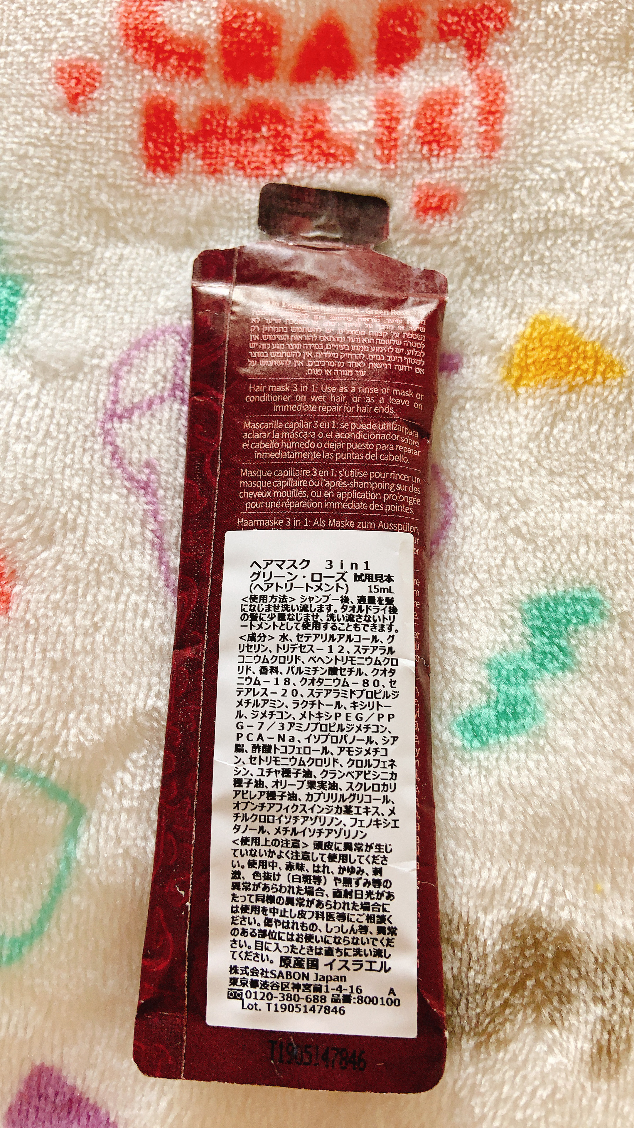 SABONヘアマスク3in1GreenRose・サボンのヘアトリートメントです!こちらはグリーンローズの香りです💚・試供品でいただきました!使ったことがないので楽しみです☺️・シャンプーして水気を切ったあとに使うみたいです!・お風呂上がりにタ...